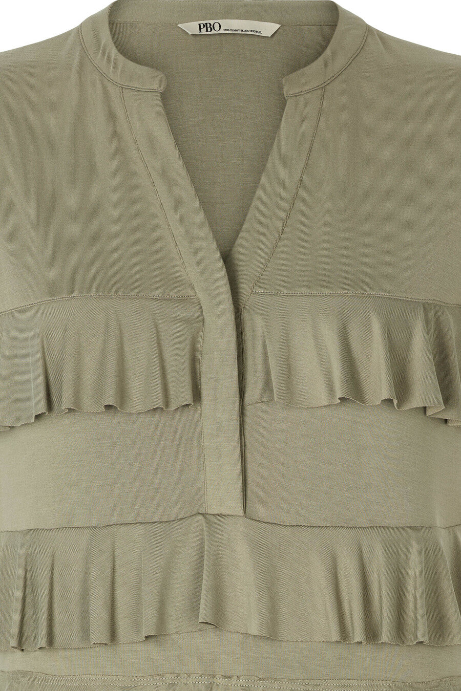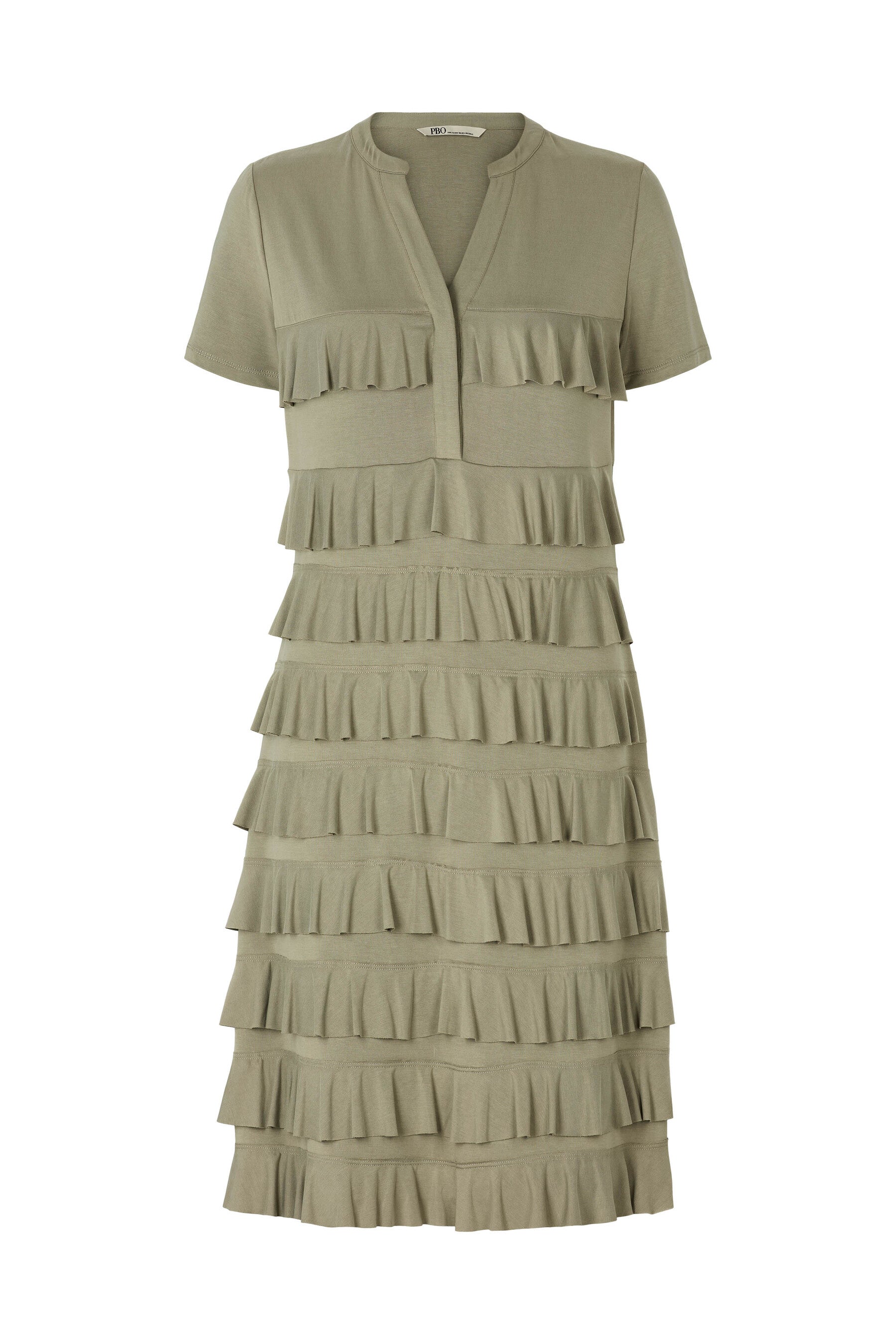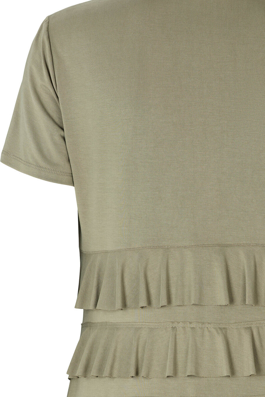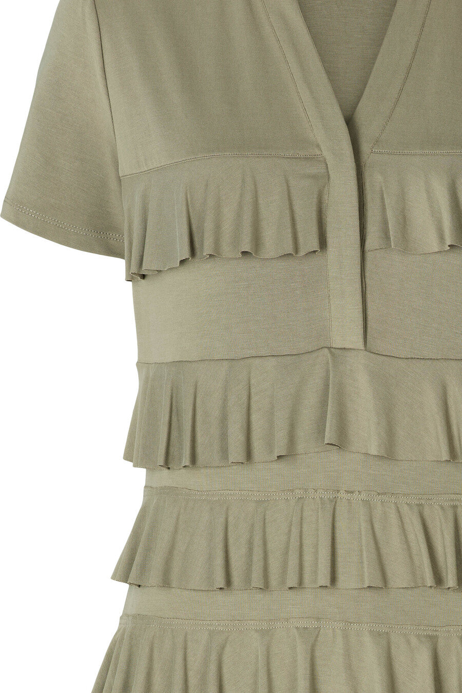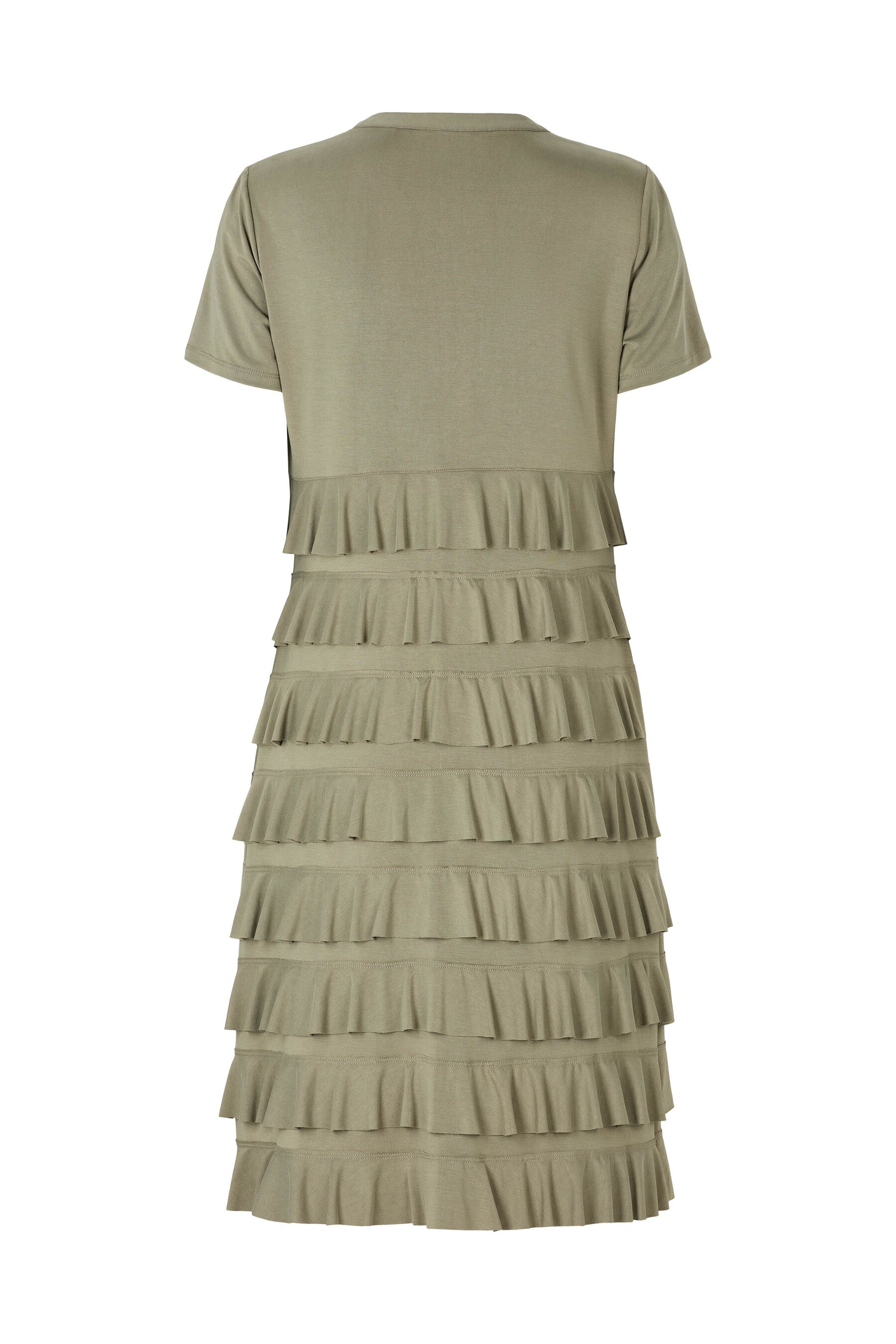 De horizontale ruffle lagen geven de jurk een speels en flatterend effect zonder te overheersen. Dankzij de soepelvallende, zachte jersey kwaliteit voelt de stof comfortabel aan op de huid en beweegt deze mooi met je mee. Perfect voor zowel een casual daglook met sandalen of sneakers als een meer geklede uitstraling met hakken.