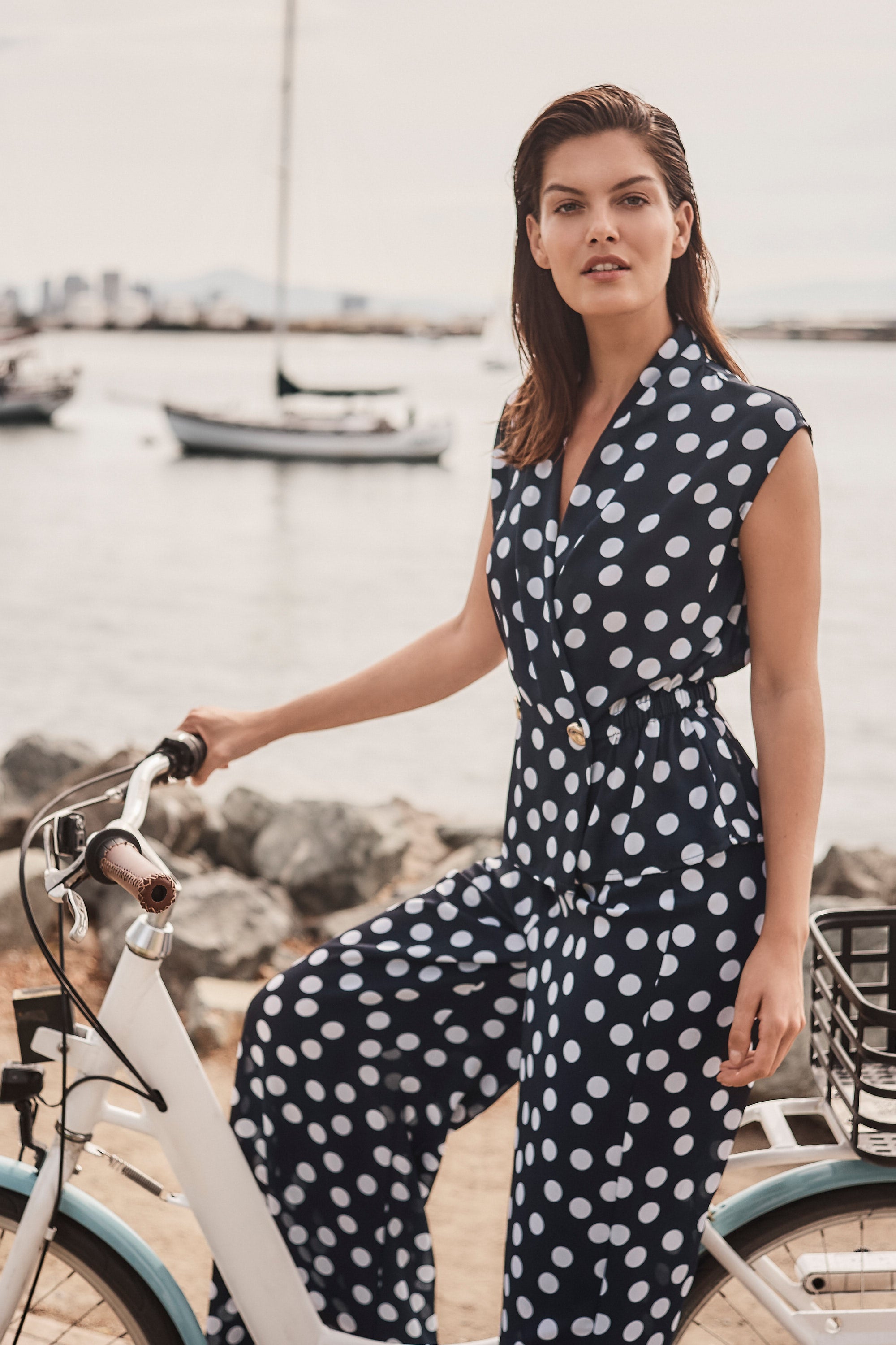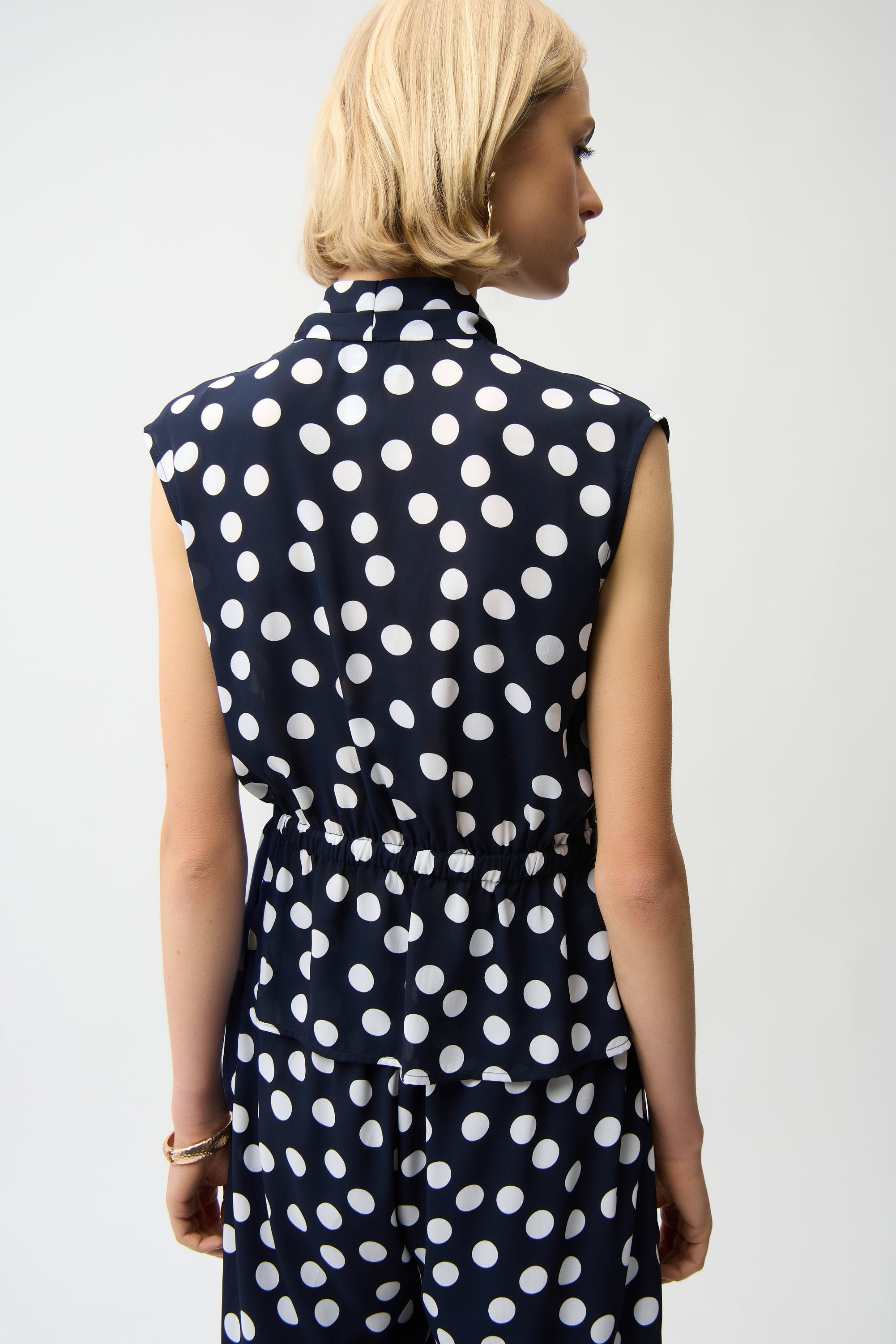 Deze stijlvolle mouwloze top met speelse polkadot print is een echte eyecatcher voor elke garderobe. De overslaghalslijn creëert een elegant silhouet, terwijl de subtiele goudkleurige knopen in de taille zorgen voor een verfijnd en vrouwelijk accent. Dankzij de licht getailleerde pasvorm en de elastische tailleband sluit de top mooi aan en flatteert hij het figuur.