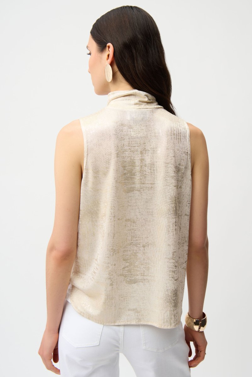 Straal pure elegantie uit met deze bijzondere mouwloze top van Joseph Ribkoff, uitgevoerd in een luxe foiled knit stof die een subtiele metallic glans geeft. De zachte gouden shimmer zorgt voor een chique, feestelijke uitstraling, terwijl de fijne plooien bij de col een verfijnde, vrouwelijke touch toevoegen.