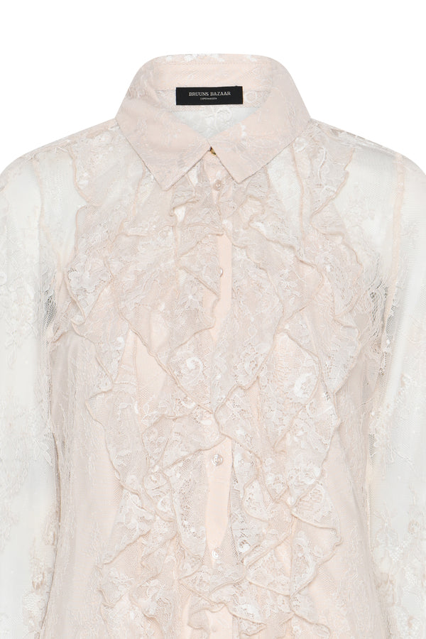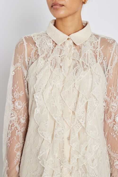 Deze romantische kanten blouse is een elegant statement piece met een verfijnde en vrouwelijke uitstraling. Het transparante ontwerp is uitgevoerd in een delicate kantkwaliteit met een subtiel bloemendessin, wat zorgt voor een luxe en lichte look. De zachte tint White Sand geeft de blouse een tijdloze en chique uitstraling.