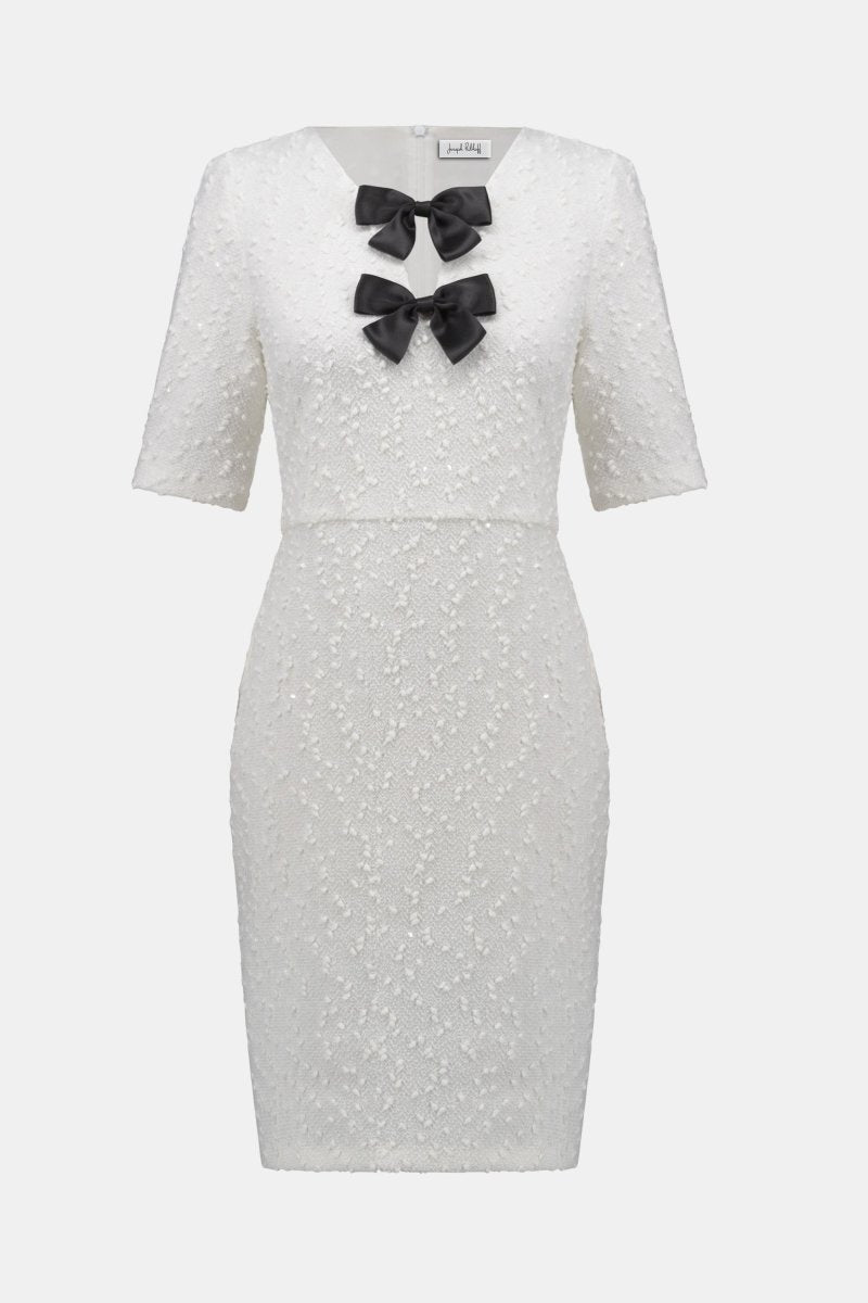 Deze prachtige witte jurk combineert klassieke elegantie met een moderne twist. Het bouclé-materiaal met subtiel reliëf geeft de jurk een luxueuze uitstraling, terwijl de twee zwarte satijnen strikjes op de halslijn zorgen voor een speelse en chique touch.