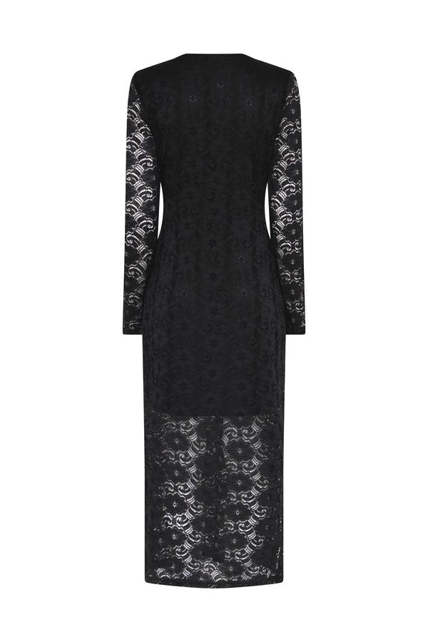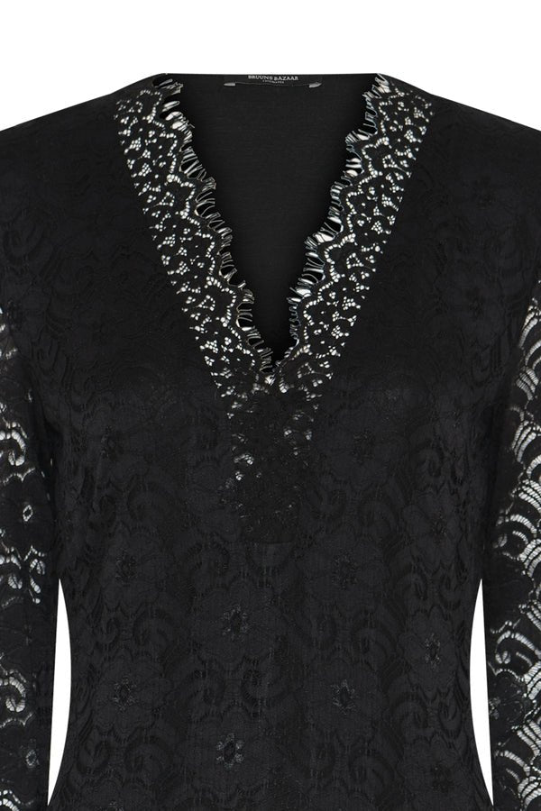 Deze verfijnde zwarte kanten jurk van Bruuns Bazaar ademt elegantie en klasse. Het lange, rechte model is volledig uitgevoerd in sierlijke kant met een subtiel bloemmotief, waardoor de jurk een tijdloze en luxueuze uitstraling krijgt. De diepe V-hals is afgewerkt met een verfijnde kanten rand, wat zorgt voor een extra vrouwelijke touch.