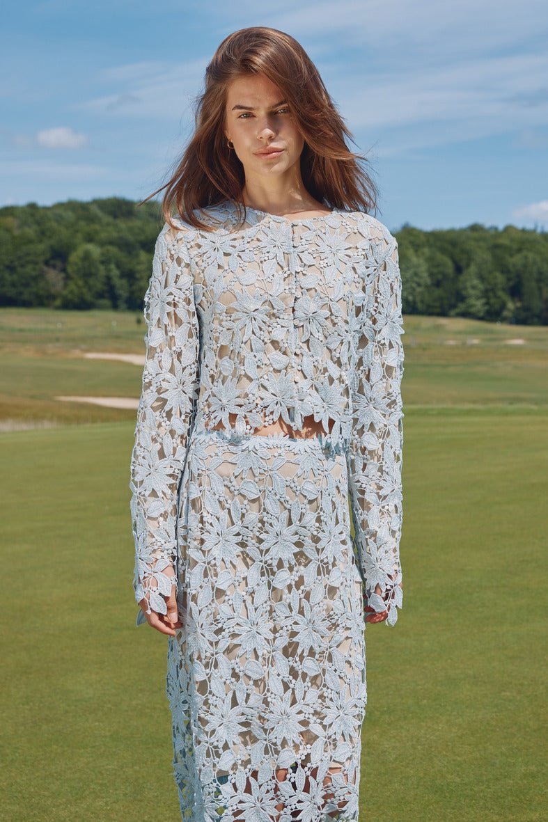 De delicate bloemenstructuur en de verfijnde afwerking maken deze top perfect voor feestelijke gelegenheden, bruiloften of stijlvolle events. Dankzij de lichtblauwe tint straalt het geheel zachtheid en elegantie uit, terwijl de licht gestructureerde pasvorm zorgt voor een mooi, vrouwelijk silhouet.