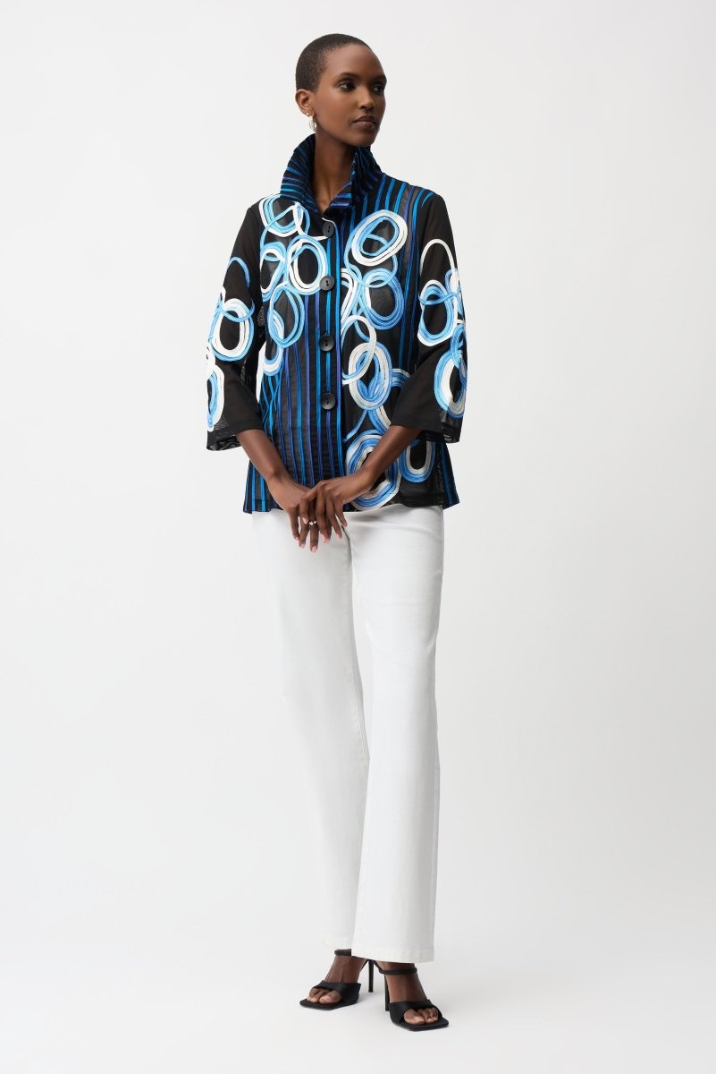 Deze opvallende blouse van Joseph Ribkoff is een echte eyecatcher dankzij het artistieke grafische dessin en de verfijnde transparante stof. Het ontwerp combineert verticale strepen met speelse, organische cirkelvormen in tinten blauw en wit, wat zorgt voor een modern en elegant contrast op de zwarte basis.