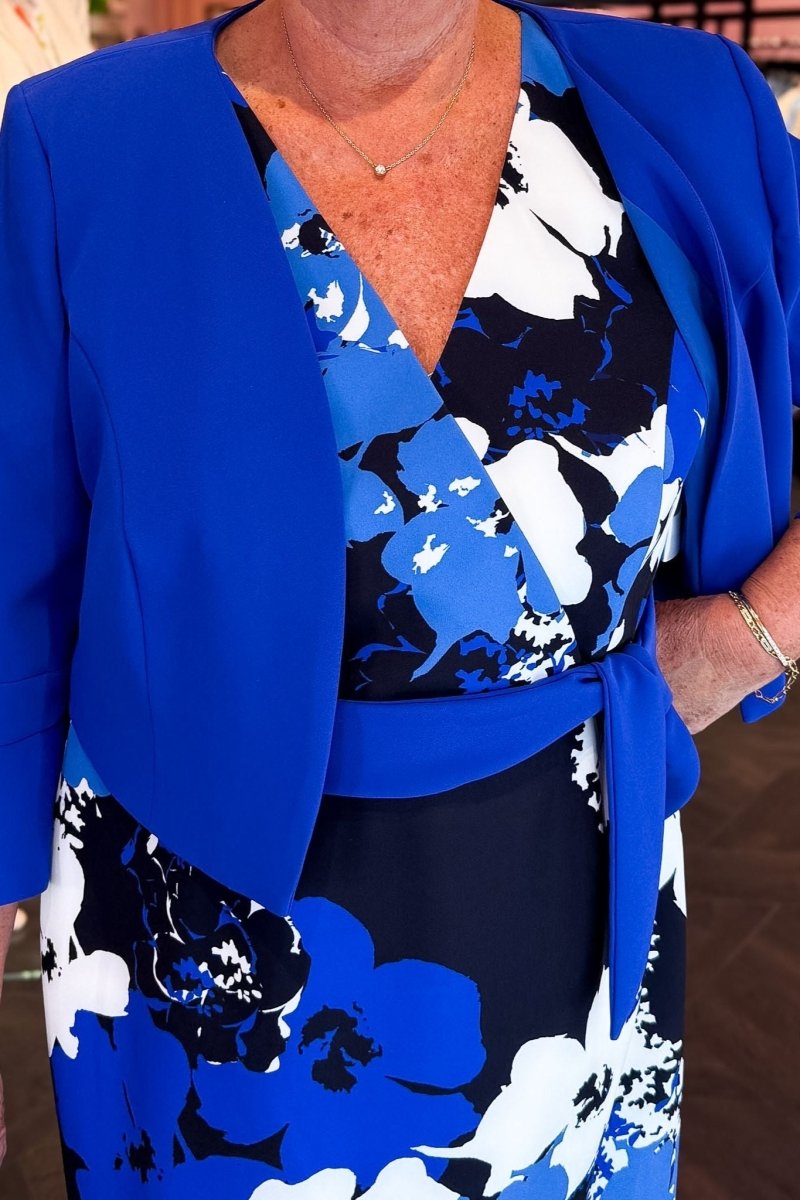 Deze stijlvolle tweedelige set is een perfecte keuze voor de moderne moeder van de bruid of bruidegom die elegantie wil combineren met comfort en klasse. De jurk heeft een flatterende, licht aangesloten pasvorm en is uitgevoerd in een verfijnde bloemenprint in diepe blauwtinten, wit en zwart. De V-halslijn zorgt voor een vrouwelijke uitstraling, terwijl de subtiele overslag en het strikdetail in de taille het silhouet mooi accentueren.