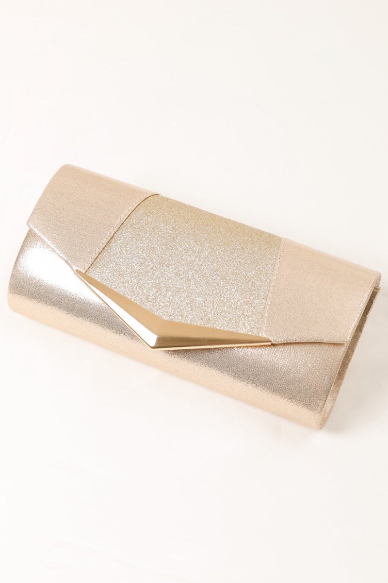 Maak je avondlook compleet met deze stijlvolle clutch. Het strakke ontwerp in combinatie met de glanzende glitterafwerking zorgt voor een chique en moderne uitstraling. De clutch is afgewerkt met een elegante metalen V-sluiting die een vleugje luxe toevoegt.