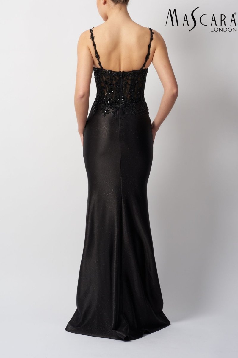 Deze adembenemende zwarte galajurk van Mascara London straalt pure klasse en vrouwelijke elegantie uit. Het bovenlijfje is uitgevoerd in verfijnde transparante tule met prachtig aangebracht kant en subtiele pailletten, waardoor een luxueuze en romantische uitstraling ontstaat. De delicate schouderbandjes en het licht getailleerde silhouet zorgen voor een elegante, vrouwelijke pasvorm.