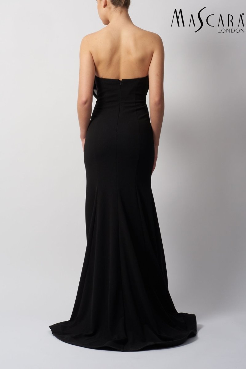De strapless halslijn wordt extra bijzonder door de grote, asymmetrische strik op het lijfje, die een krachtig en stijlvol statement maakt. Dit detail geeft de jurk een exclusieve en modieuze uitstraling, zonder afbreuk te doen aan haar klasse. De nauwsluitende pasvorm benadrukt de taille en heupen, terwijl de lange rok elegant uitloopt en een mooie flow creëert bij iedere beweging.