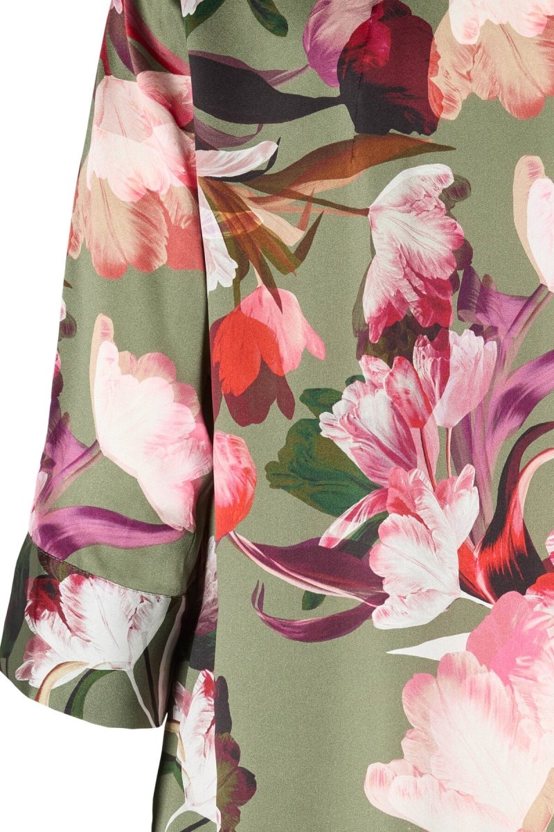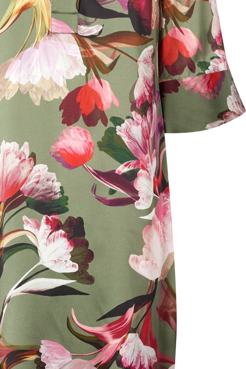 Deze elegante midi jurk is vervaardigd uit een luxe zijdeblend en straalt pure verfijning uit. Het rijke bloemendessin in warme tinten op een zachte armygroene basis geeft de jurk een vrouwelijke en tijdloze uitstraling. De subtiele glans van de zijde zorgt voor een exclusieve look en een soepel vallend silhouet.