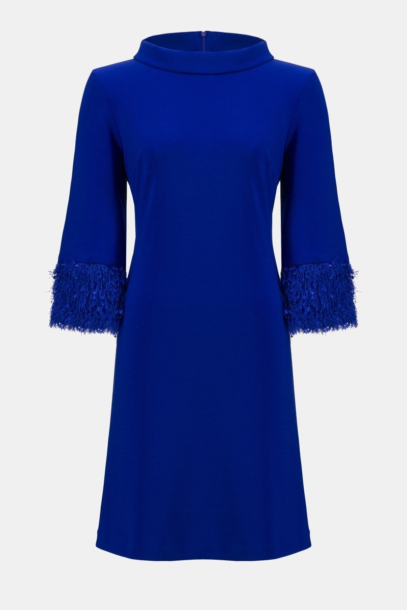 Deze opvallende koningsblauwe jurk is een echte eyecatcher voor elke gelegenheid. Het minimalistische A-lijn silhouet wordt prachtig geaccentueerd door de elegante opstaande kraag en de 3/4-mouwen met speelse franjes. Deze unieke mouwdetails geven de jurk een chique én modieuze flair.