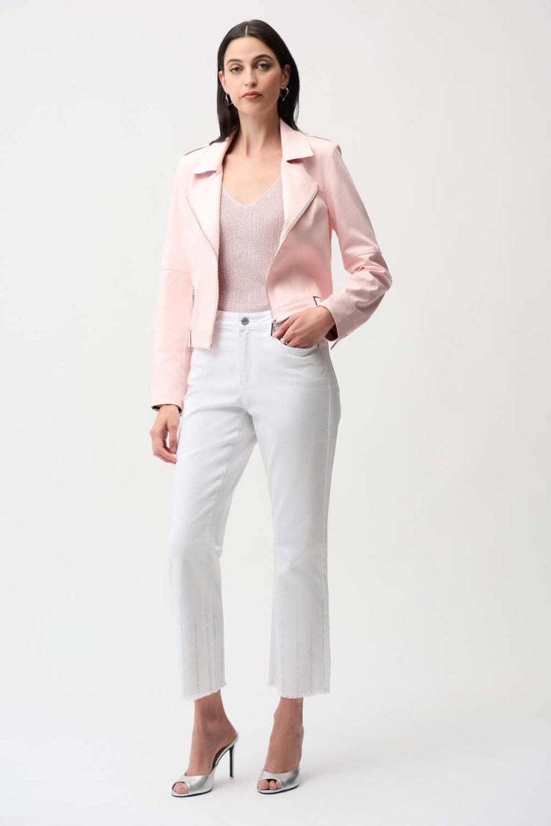 Maak kennis met dit stijlvolle, zachtroze biker-inspired jasje van Joseph Ribkoff – een perfecte combinatie van elegantie, comfort en moderne flair. Het jasje is uitgevoerd in een hoogwaardige foiled faux suede, wat zorgt voor een subtiele shimmer en een luxueuze uitstraling. De stof voelt zacht en soepel aan, waardoor het jasje heerlijk draagt en mooi in vorm blijft.