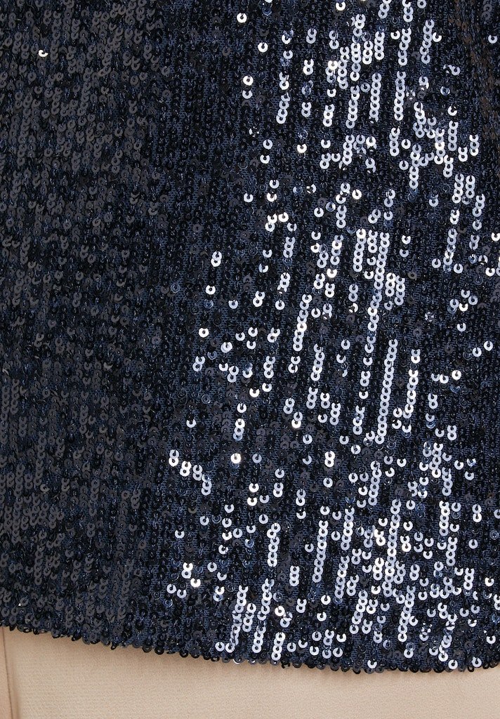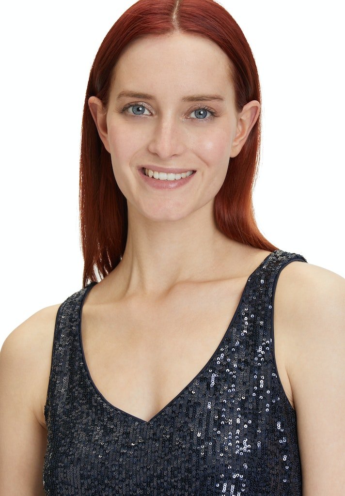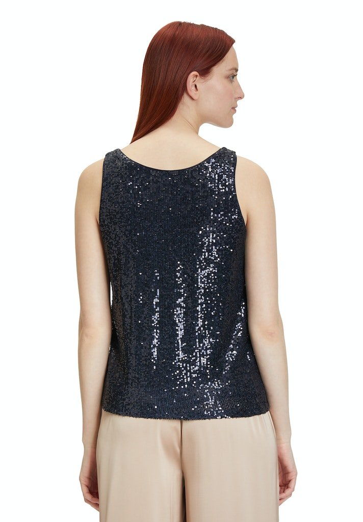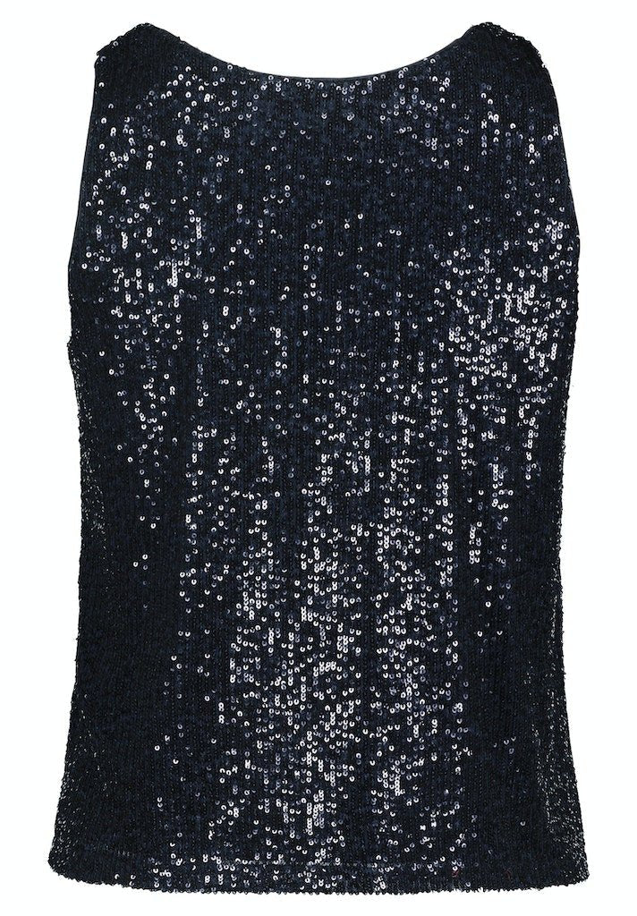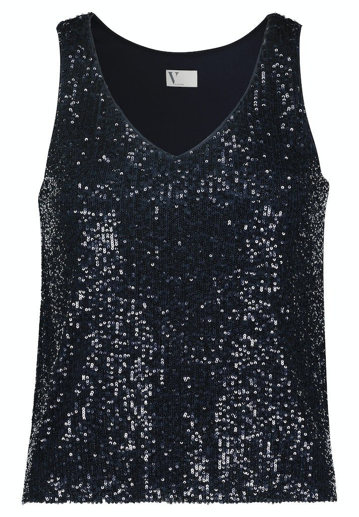 Deze elegante top van V by Vera Mont is een absolute blikvanger voor elke feestelijke gelegenheid. De top is volledig bedekt met fonkelende donkerblauwe pailletten die een luxe, glinsterend effect creëren bij elke beweging. De diepe V-hals en mouwloze snit zorgen voor een vrouwelijke en flatterende uitstraling, terwijl de rechte pasvorm comfortabel en stijlvol om het lichaam valt.
