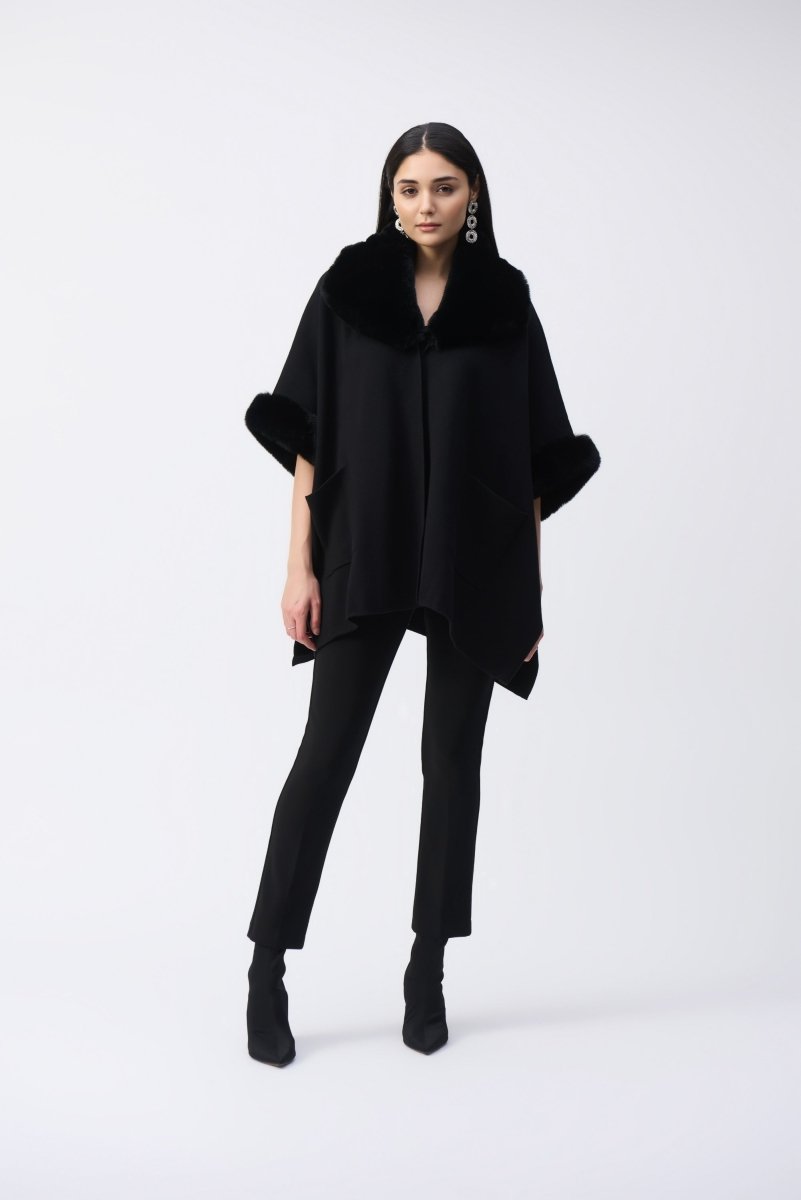 Voeg een vleugje verfijning en elegantie toe aan je wintergarderobe met deze schitterende zwarte of vanille cape van Joseph Ribkoff. Dit tijdloze ontwerp is vervaardigd uit hoogwaardige materialen en afgewerkt met een zachte faux fur kraag en manchetten, die zorgen voor een luxueuze uitstraling en extra warmte op koude dagen.