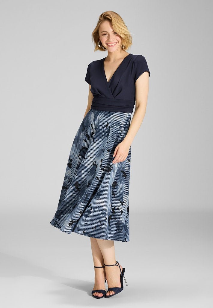 De midi-rok valt soepel en heeft een uniek design: een mix van verticale strepen en een abstracte bloemenprint in blauwtinten, wat de jurk een moderne, dynamische uitstraling geeft. De hoogwaardige stof zorgt voor een mooie beweging en comfortabele pasvorm.
