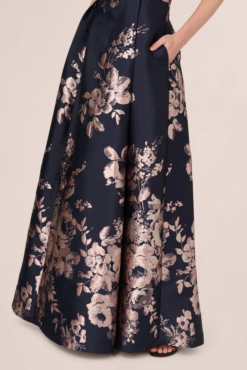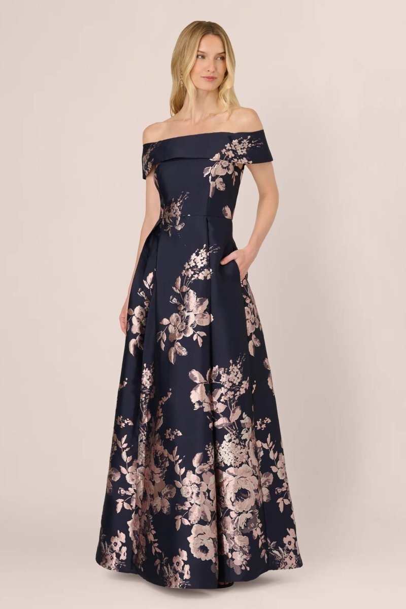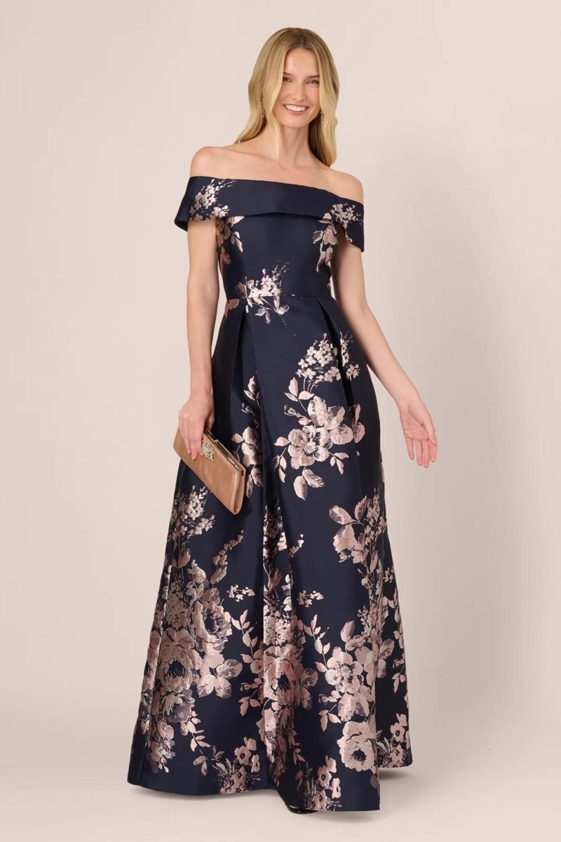 Betreed iedere feestelijke gelegenheid in pure elegantie met deze prachtige off-shoulder galajurk van Adrianna Papell. De japon is vervaardigd uit een luxe, glanzende jacquardstof met een rijk bloemmotief in metallic blush, wat een chique en tijdloze uitstraling creëert.