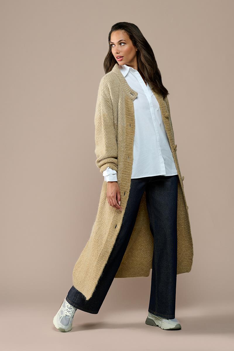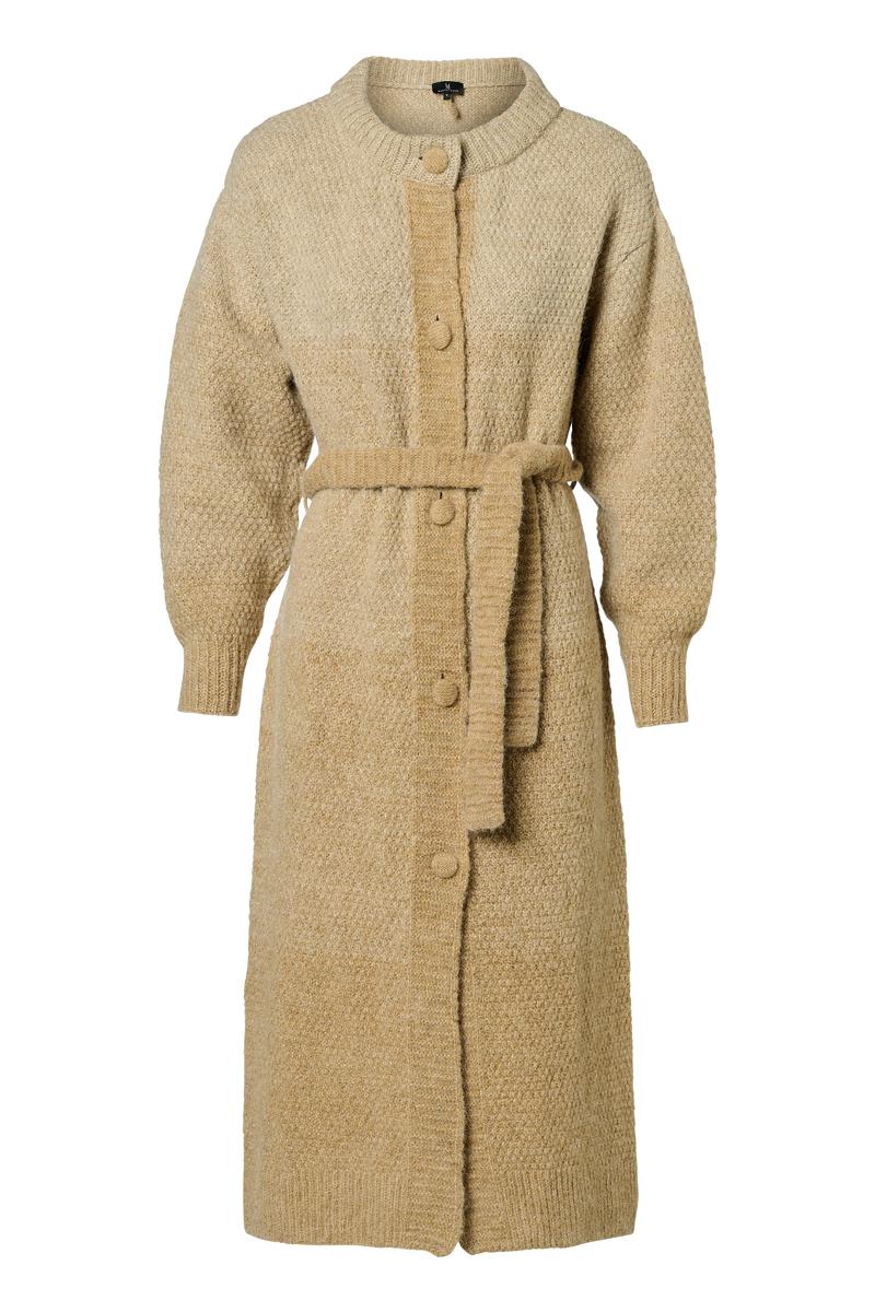 Het Evelyn vest van Mart Visser is een stijlvolle must-have voor het najaar. Dit lange, zandkleurige gebreide vest is vervaardigd uit een luxe mix van wol, acryl en polyamide en is subtiel afgewerkt met goud lurexgaren voor een verfijnde glans. De rechte pasvorm met lange mouwen en brede ribboorden zorgt voor een comfortabel silhouet, terwijl de strikceintuur de taille elegant accentueert.