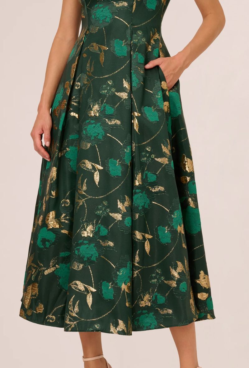 Deze betoverende midi-jurk straalt pure elegantie uit. Het off-shoulder ontwerp benadrukt de schouders prachtig, terwijl de metallic jacquard stof met gouden details een luxe en feestelijke uitstraling geeft. De flatterende A-lijn snit en praktische steekzakken maken deze jurk zowel stijlvol als comfortabel.