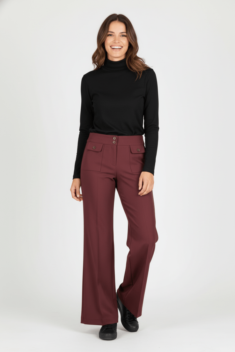 De pantalon is afgewerkt met klepzakjes met knoopsluiting aan de voorzijde, wat het ontwerp een subtiel speels accent geeft. Verkrijgbaar in de kleuren Black en Navy, perfect voor zowel zakelijke looks als een chique avondoutfit.
