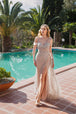 Enter the glittering world of eveningwear in style with this exclusive evening gown, embellished with thousands of sparkling stones. Sleeveless and featuring delicate spaghetti straps, this elegant piece flaunts detailed off-the-shoulder straps embellished with sparkling stones, while the fitted design hugs your figure for a an enchanting appearance at any gala party.