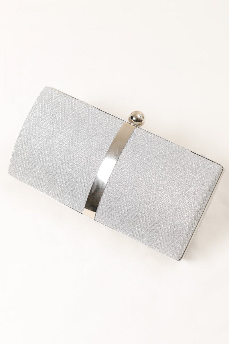 Deze clutch combineert elegantie met een moderne uitstraling. Het subtiele visgraatpatroon in glanzende stof geeft de tas een verfijnde textuur, terwijl de metalen middenband met bolsluiting een luxe detail toevoegt.