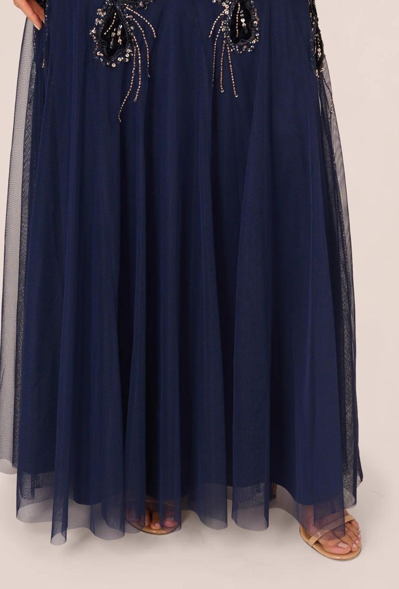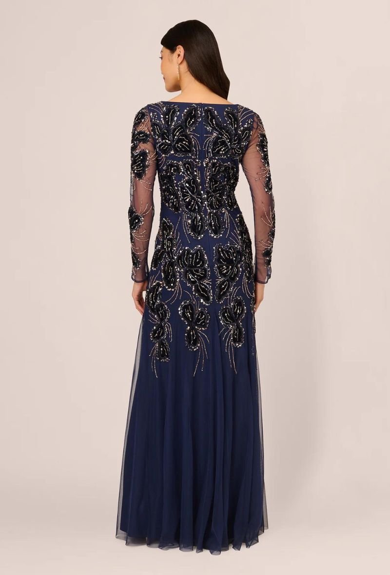 Luxurious beading and velvet are on full display in this mermaid gown. This formal dress features a V-neckline framed by inset sheer panels, sheer long sleeves, and a mermaid skirt with a godet skirt. Crafted from knitted mesh, this long-sleeved dress is adorned with sequin and beaded flowers, accented with rich velvet at the center of the skirt. A center back zipper completes this evening gown. Styled with neutral heels and a contrasting clutch, this long-sleeved dress will elevate any evening.