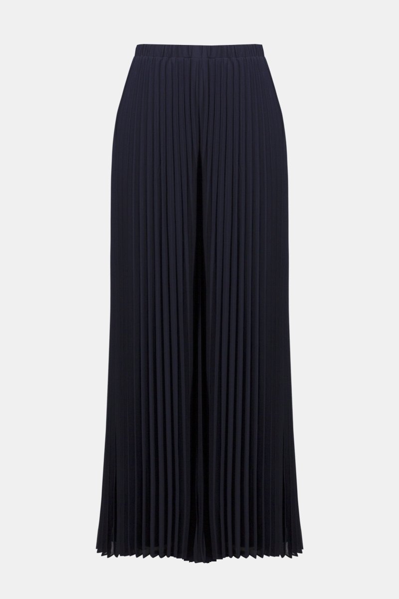 Deze navy broek is een elegante eyecatcher die stijl en comfort perfect combineert. Het ontwerp valt op door de fijne plisséplooien, die zorgen voor een luchtige, sierlijke beweging bij elke stap. De wijde pijpen geven de broek een moderne, vrouwelijke uitstraling en maken hem ideaal voor zowel feestelijke gelegenheden als een chique avondlook.