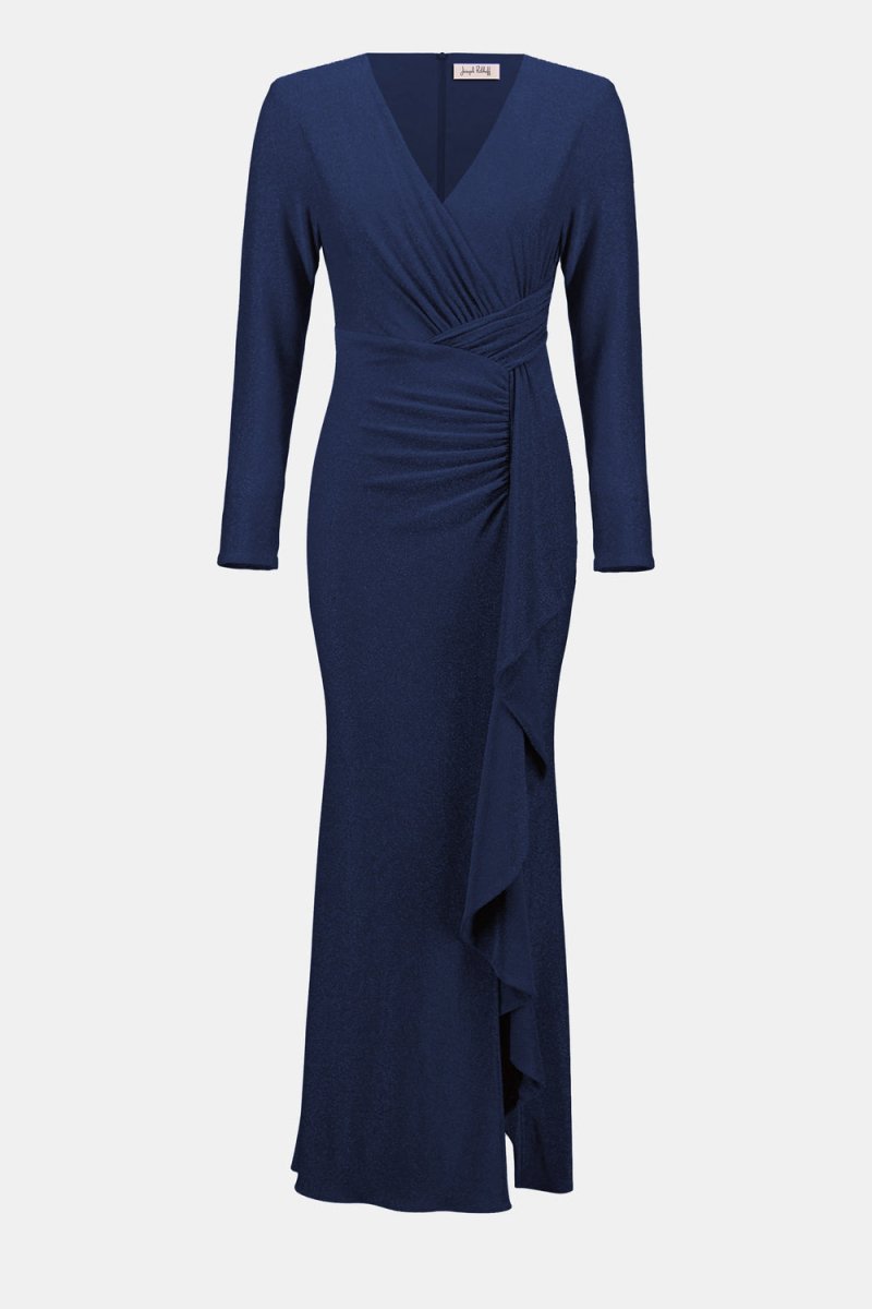 De jurk is vervaardigd uit een comfortabele, licht glanzende stretchstof die prachtig aansluit op het lichaam. De diepe V-hals en geplooide tailleband creëren een flatterend silhouet, terwijl de asymmetrische volant langs de rok zorgt voor een sierlijk effect bij elke beweging. De elegante lange mouwen maken deze jurk ook geschikt voor koelere avonden.