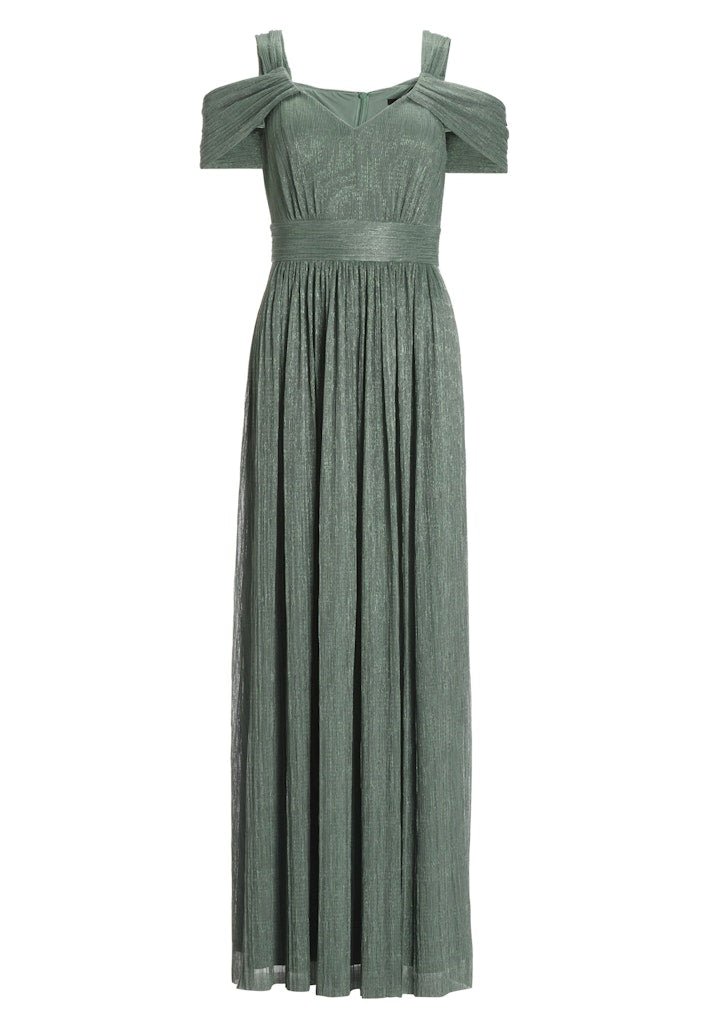 Deze stijlvolle maxi jurk in een zachte saliegroene kleur straalt elegantie uit met een subtiele glitter verwerkt in de stof. De jurk is ontworpen met een vrouwelijke v-hals en brede schouderbanden die zorgen voor een comfortabele en flatterende pasvorm. De afhangende mouwtjes geven de jurk een romantisch accent, terwijl de tailleband het silhouet mooi benadrukt. Perfect voor een feestelijke gelegenheid of een zomerse avond uit.