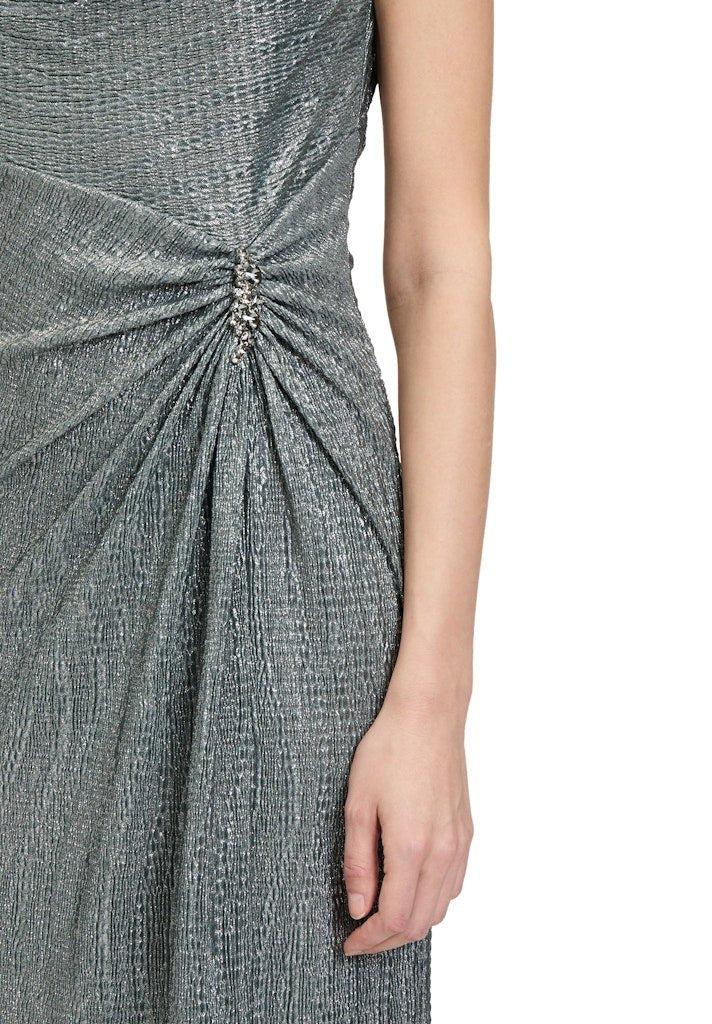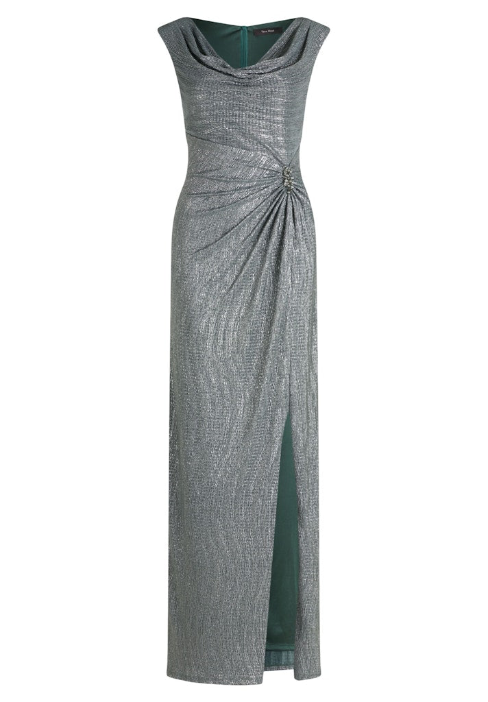 Omarm tijdloze elegantie met deze prachtige maxi jurk, ontworpen om je silhouette op zijn best te laten uitkomen. De jurk is gemaakt van een rekbare stof die moeiteloos comfort en stijl combineert. De subtiele plooien op de buik creëren een flatterend effect, terwijl de watervalhalslijn en de delicate kapmouwen een vleugje verfijning toevoegen. Verkrijgbaar in de betoverende kleuren crème met zilver of donkergroen met grijstinten, straalt deze jurk luxe en charme uit.