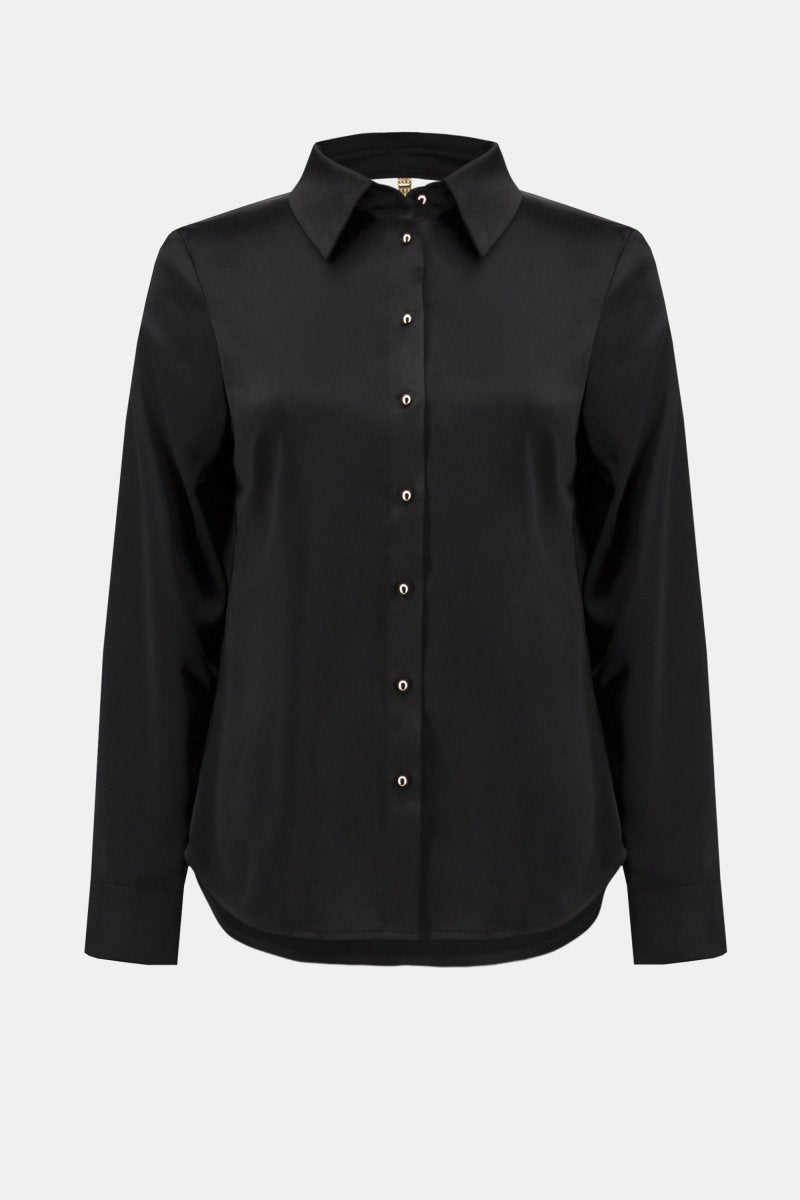 Deze elegante zwarte blouse is vervaardigd uit een gladde satijnachtige stof die soepel om het lichaam valt. Het ontwerp heeft een klassieke overhemdkraag en lange mouwen met manchetten, afgewerkt met goudkleurige knopen die voor een luxe uitstraling zorgen. Aan de voorzijde sluit de blouse met een rij knopen, terwijl de achterkant verrast met een diepe V-hals en een schitterend sierdetail met strassteentjes, wat een subtiele glamour toevoegt.