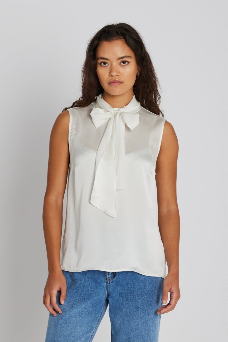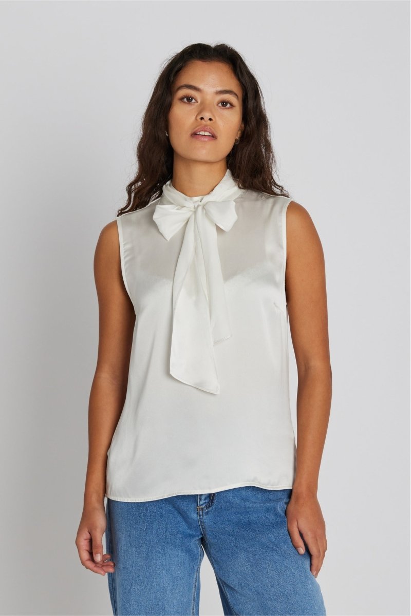 De vrouwelijke striksluiting bij de hals geeft de top een tijdloze, elegante touch. Draag de strik losjes vallend voor een nonchalant effect of knoop hem netjes voor een meer geklede uitstraling. De mouwloze snit en de vloeiende pasvorm zorgen voor een flatterend silhouet dat mooi langs het lichaam valt zonder te tekenen.
