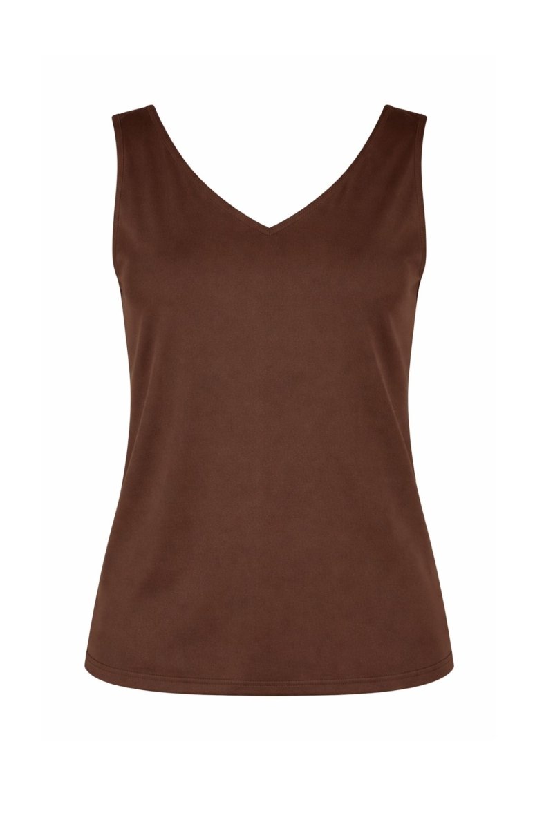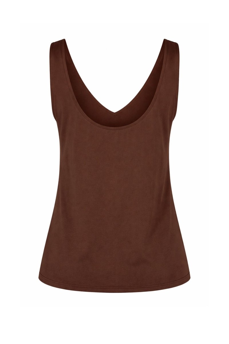 Deze elegante top in de warme kleur coconut is een onmisbare basic in iedere garderobe. Dankzij het minimalistische design en de hoogwaardige afwerking is dit item perfect voor zowel casual als meer geklede looks. De top is uitgevoerd met een flatterende V-hals aan de voorzijde en een vrouwelijke, ronde hals aan de achterzijde, waardoor je eenvoudig kunt variëren in uitstraling.
