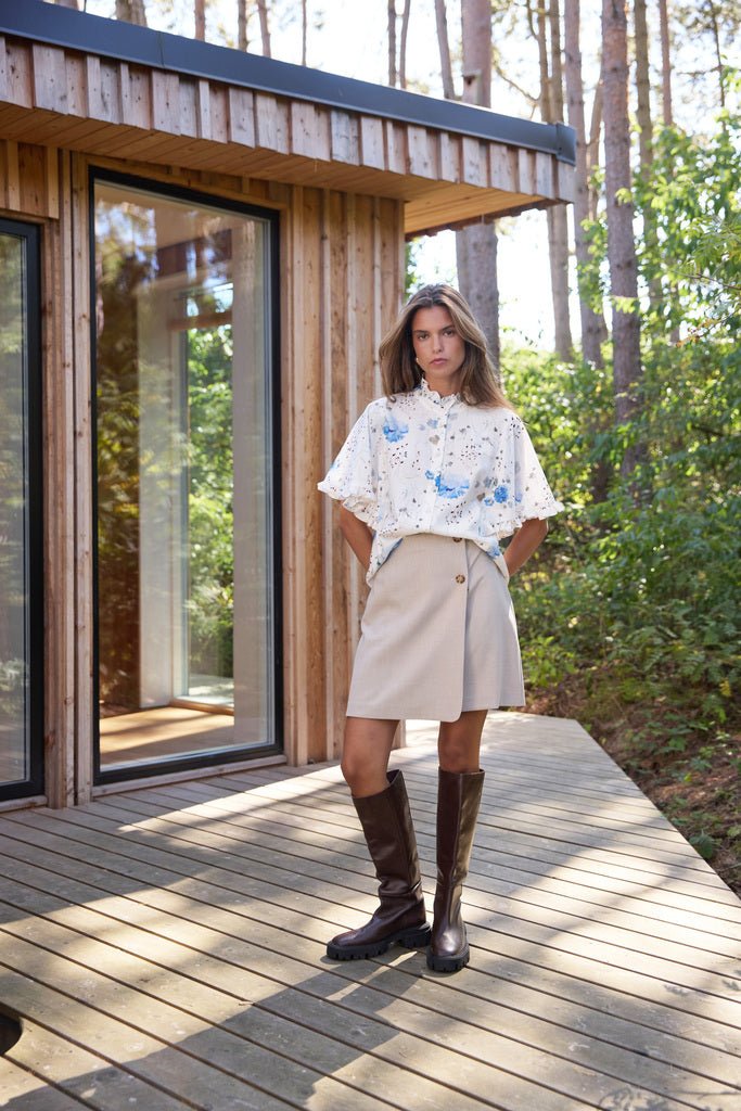 Deze elegante korte rok in een verfijnde light sand tint is een perfecte combinatie van minimalisme en moderne details. Het wikkelmodel met asymmetrische voorzijde zorgt voor een speels en flatterend silhouet, terwijl de decoratieve knopen een subtiel stijlaccent toevoegen.