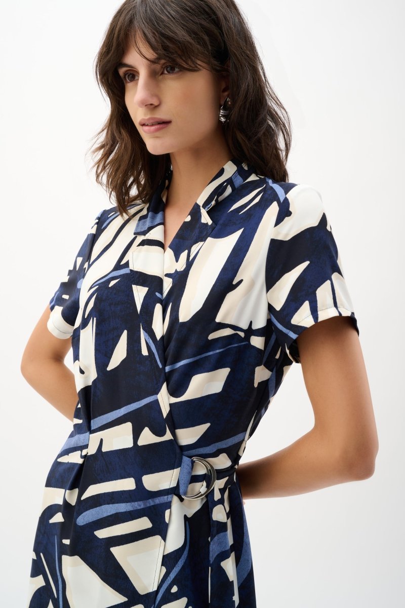 Deze stijlvolle jurk van Joseph Ribkoff combineert een klassieke overhemdstijl met een moderne, grafische print in diepe navy- en off-white tinten. De elegante overslagsluiting en de subtiele taillering met strikceintuur zorgen voor een vrouwelijk silhouet dat zowel flatterend als comfortabel is.