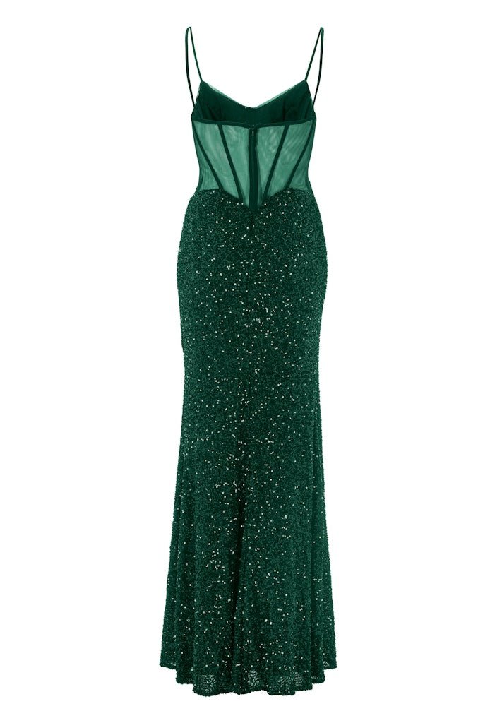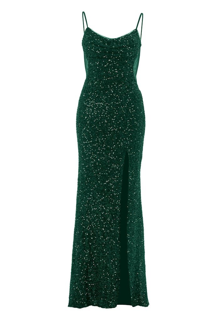 Ein bezauberndes Abendkleid! Dieses komplett mit Pailletten besetzte Slipdress glitzert und ist mit aufregenden Details ein echter Hingucker: Feine Träger, ein anmutiger Wasserfallausschnitt und ein transparenter Rücken lassen Ihren Auftritt erstrahlen. Ihr Moment auf dem roten Teppich ist garantiert!