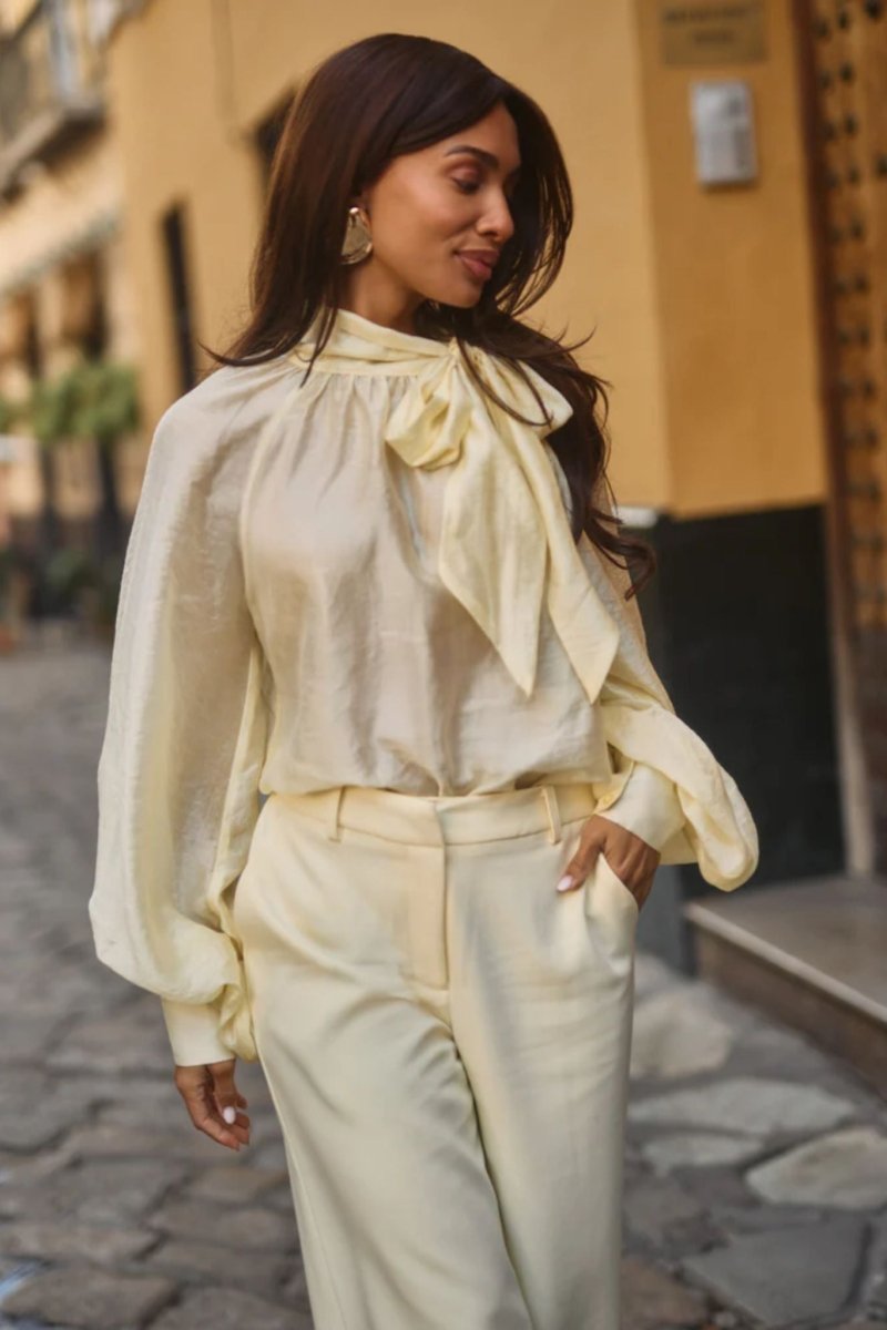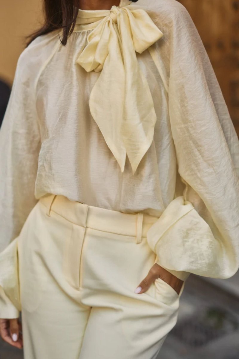 Deze verfijnde blouse in zachte butter yellow tint straalt pure elegantie uit. De subtiele glans van de lyocellblend geeft de stof een luxe, zijdeachtige uitstraling, terwijl de luchtige kwaliteit zorgt voor een soepele en vrouwelijke valling. De hoge hals met strikdetail vormt een stijlvolle eyecatcher en geeft de blouse een romantische, chique touch.