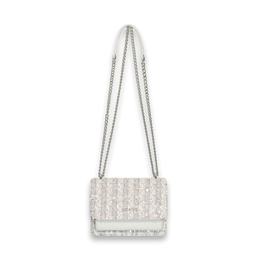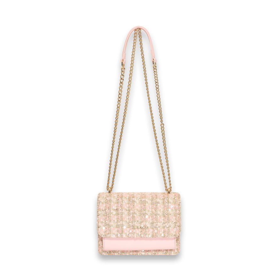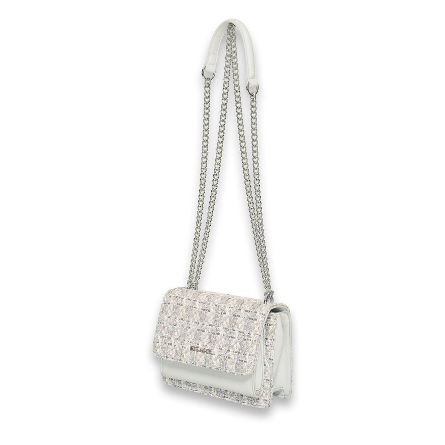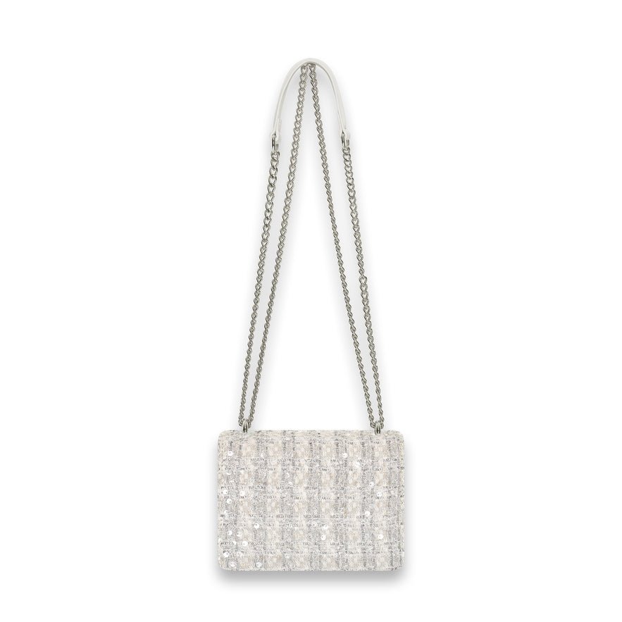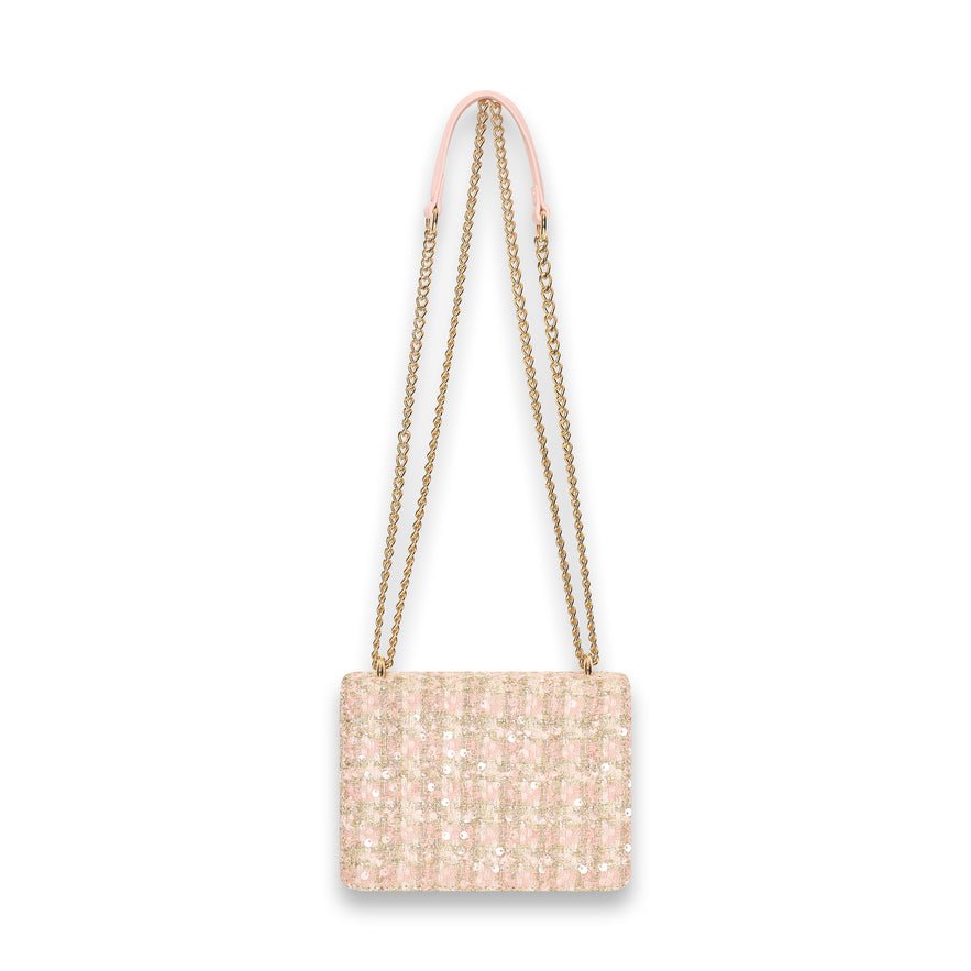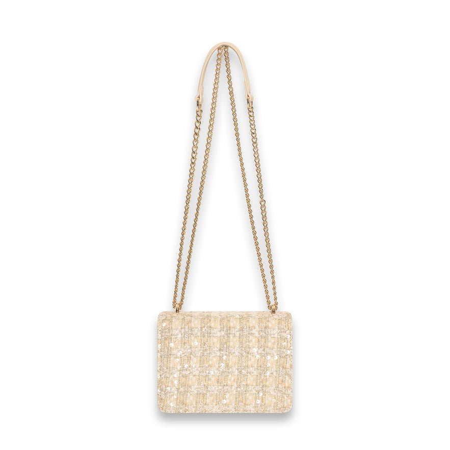 Deze elegante crossbodytas is een echte eyecatcher en perfect voor feestelijke gelegenheden. De tas is uitgevoerd in een luxe tweed-achtige structuur met subtiele glans en pailletten, wat zorgt voor een chique en vrouwelijke uitstraling. Het compacte, rechthoekige model geeft de tas een tijdloze en verfijnde look.