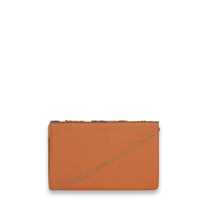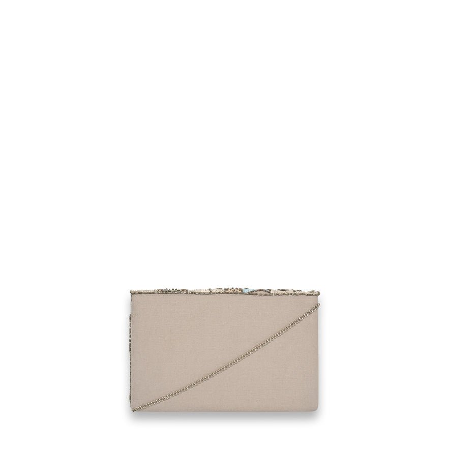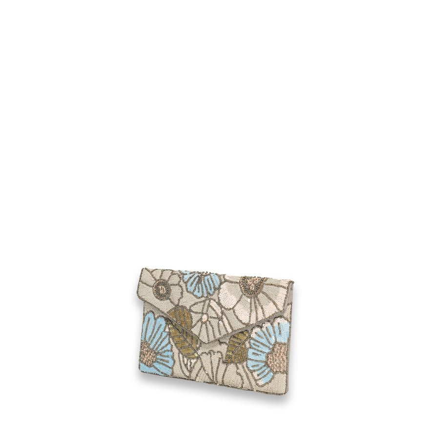 Deze opvallende clutch is een waar statement piece voor speciale gelegenheden. De tas is rijkelijk versierd met een verfijnd bloemenpatroon van kraaltjes en pailletten, wat zorgt voor een luxueuze en ambachtelijke uitstraling. De envelopvormige overslag geeft de clutch een elegante en tijdloze look.