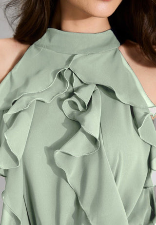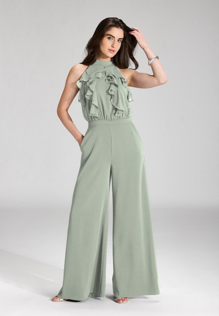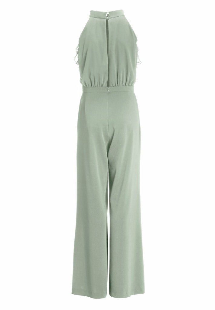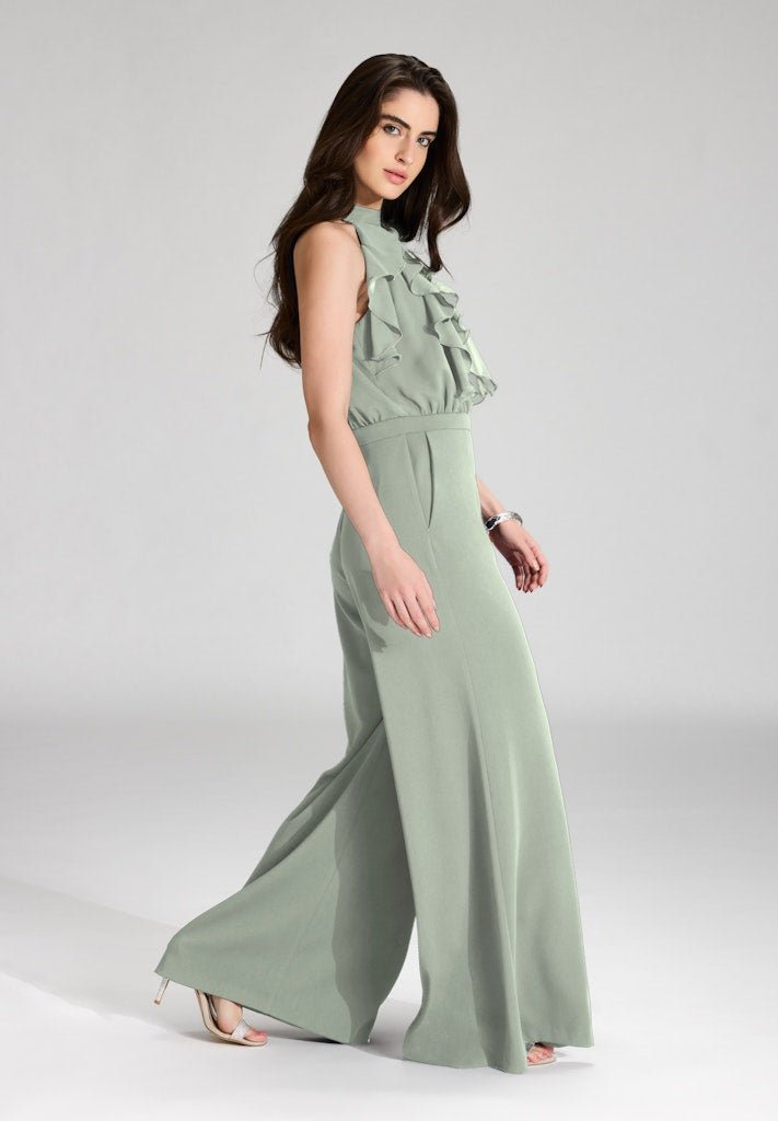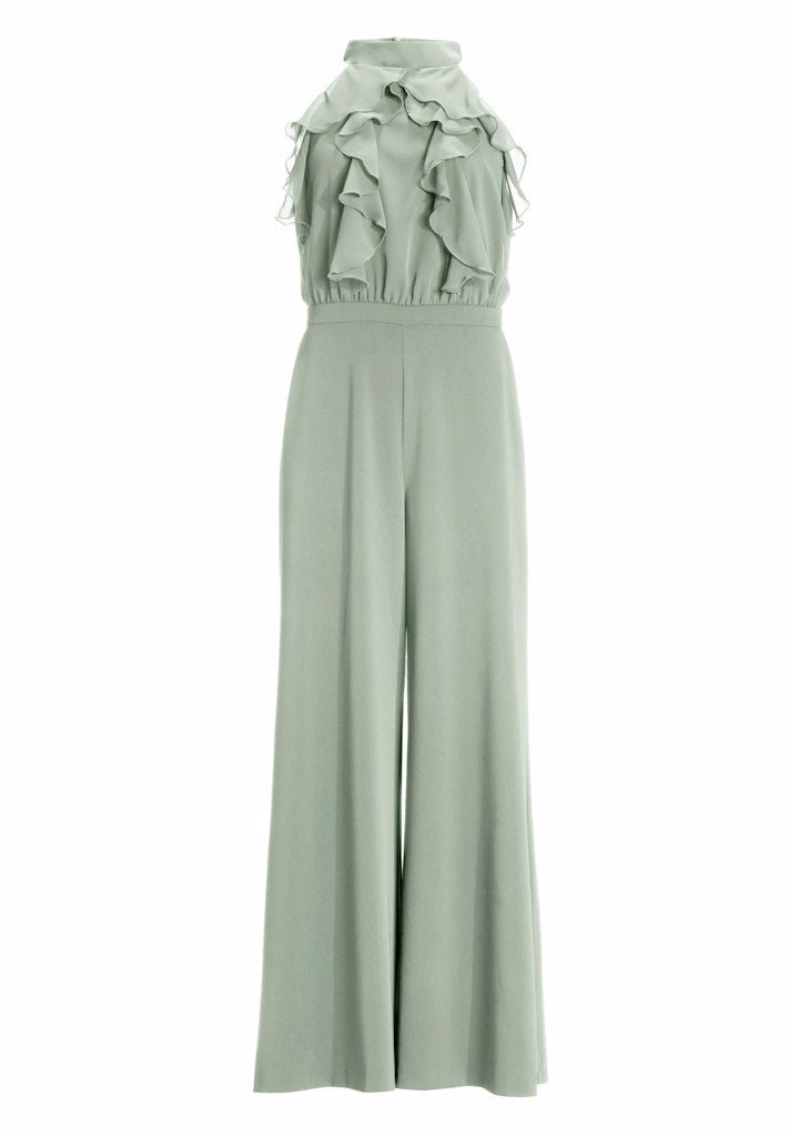 Stap stijlvol voor de dag met deze elegante zachtgroene jumpsuit. Het mouwloze ontwerp met een hoge halslijn en verfijnde ruches aan de voorzijde zorgt voor een vrouwelijke en speelse uitstraling. De soepel vallende stof en het wijde pijpenmodel creëren een vloeiende en flatterende pasvorm die comfort en klasse moeiteloos combineert.