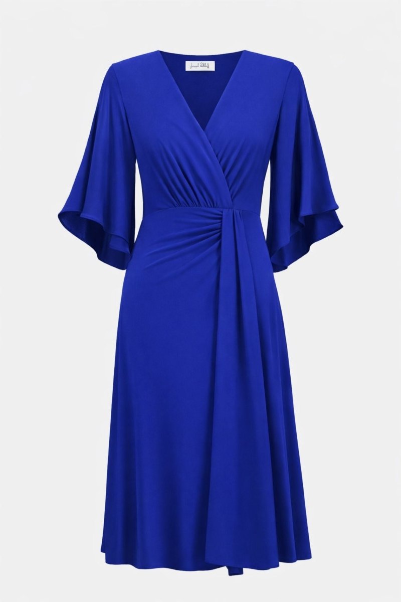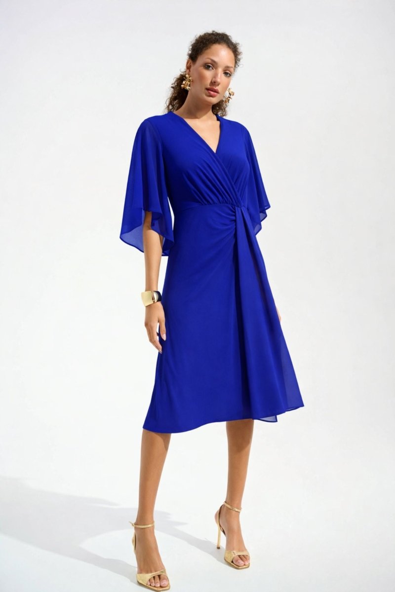 Deze elegante jurk uit de signature collectie van Joseph Ribkoff is een verfijnde keuze voor elke bijzondere gelegenheid. De vrouwelijke wikkel-look met V-hals accentueert het decolleté op subtiele wijze, terwijl de soepel vallende stof prachtig met je meebeweegt. De korte, zwierige vlindermouwen geven de jurk een luchtige en romantische uitstraling.