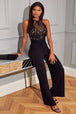 Dieser stilvolle schwarze Neckholder-Jumpsuit ist eine perfekte Kombination aus Eleganz und Modernität. Der ärmellose Overall hat ein wunderschönes Spitzenoberteil mit beigem Hintergrund, das für einen raffinierten und schicken Look sorgt. Die taillierte Passform und der offene Rücken betonen Ihre Figur auf schmeichelhafte Weise. Dieser Overall ist ideal für einen Abend oder einen besonderen Anlass und lässt Sie mit seinem einzigartigen und verführerischen Design glänzen.
