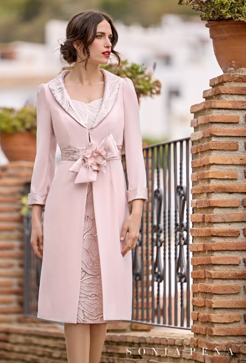 Stijlvolle en elegante cocktailjurk met bijpassende jas van Sonia Peña, perfect voor bruiloften en formele gelegenheden. Verkrijgbaar in zachtroze en navy. De kanten details, subtiele glans en taille-geaccentueerde pasvorm met strik en bloemapplicatie zorgen voor een verfijnde uitstraling. De lange mouwen en soepele stof bieden comfort en klasse.