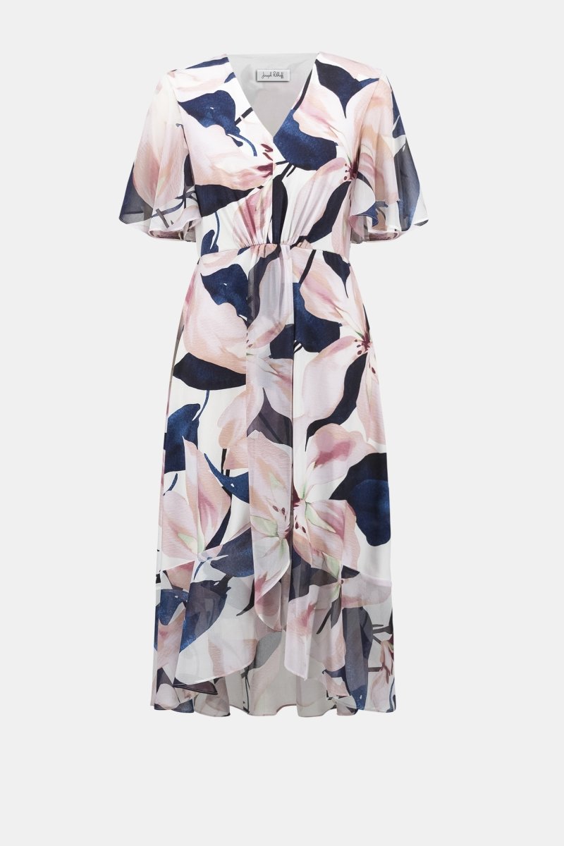 Deze vrouwelijke en stijlvolle jurk uit de Joseph Ribkoff Signature collectie combineert comfort met een luxe uitstraling. De jurk is uitgevoerd in een combinatie van silky knit en chiffon, wat zorgt voor een soepel vallend silhouet en een lichte, elegante beweging tijdens het dragen. De verfijnde bloemenprint in zachte pastel- en blauwtinten geeft de jurk een frisse en moderne uitstraling.