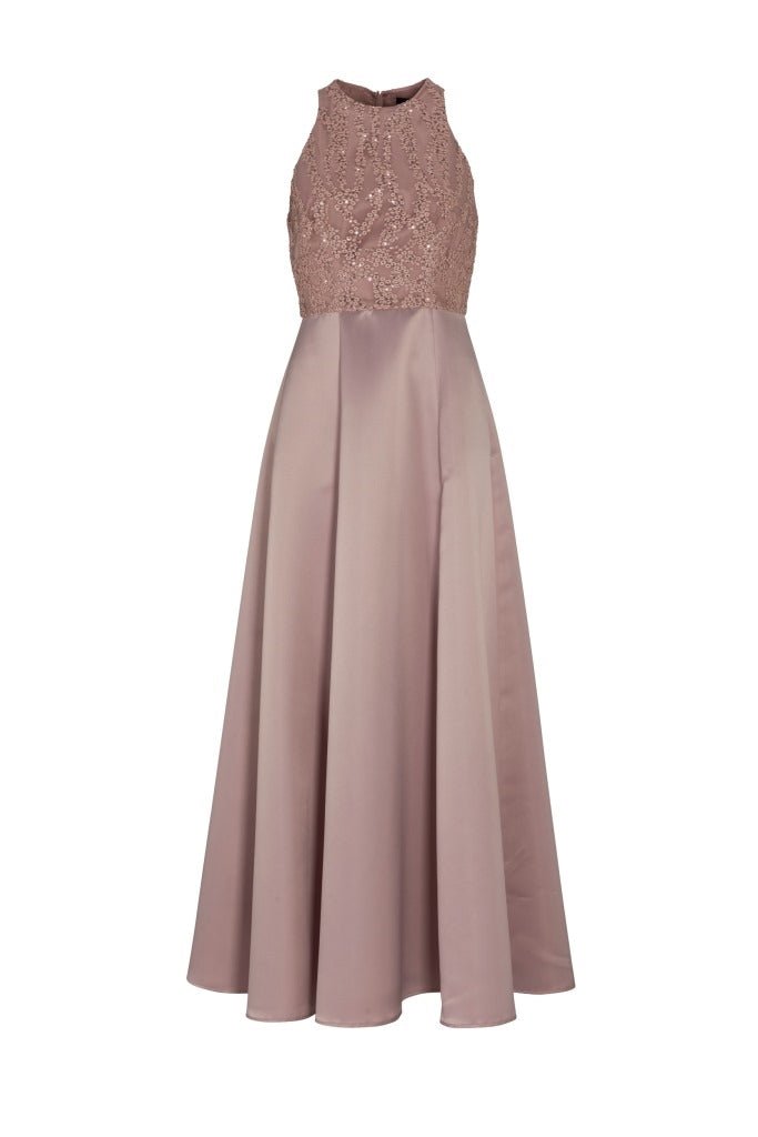 Maxikleid, dessen Oberteil eine Netzschicht mit Stickereien und Pailletten hat. Der Rock endet in einem wunderschönen Satinstoff.
