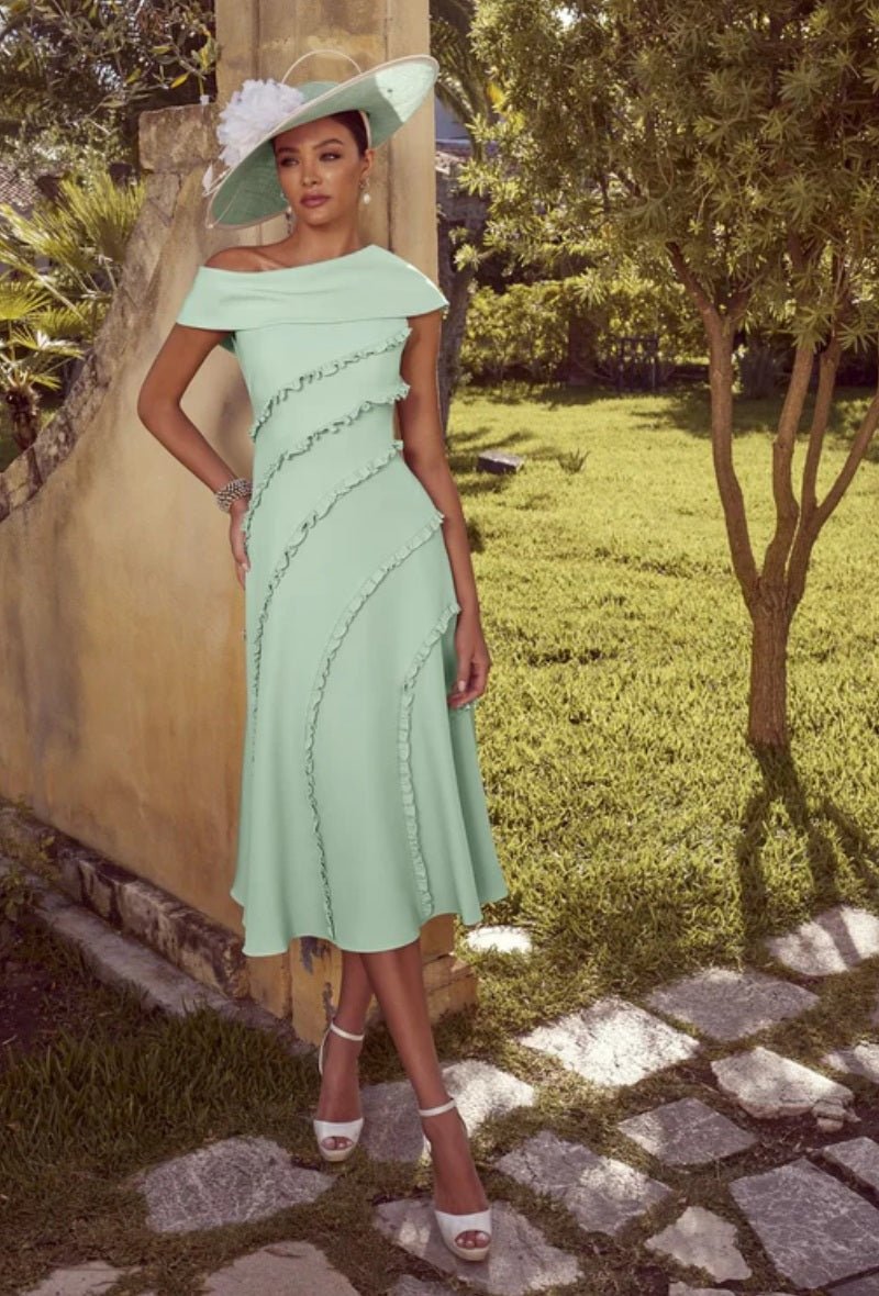 Uitgevoerd in een zachte mintkleur, is deze jurk de perfecte keuze voor de moeder van de bruid of bruidegom tijdens een bruiloft in pasteltinten. De lichte en frisse kleur harmonieert prachtig met de romantische sfeer van de dag, terwijl het A-lijn silhouet zorgt voor een flatterende pasvorm en draagcomfort.