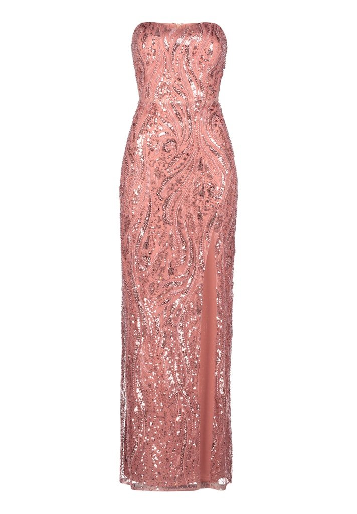 Betoverend en elegant, deze galajurk in een zachte poederroze kleur is een perfecte keuze voor een onvergetelijke avond. De hartvormige halslijn en accentuerende pasvorm zorgen voor een vrouwelijke uitstraling, terwijl de glinsterende pailletten de jurk een sprankelende touch geven. De maxilengte en luchtige materiaalmix van polyester en tule maken het ontwerp licht en gracieus.