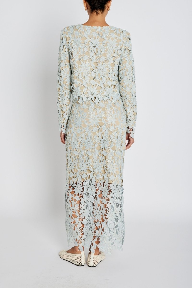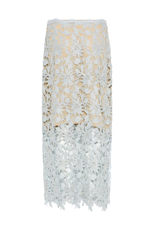 Het verfijnde florale kantpatroon geeft de rok een romantische en chique uitstraling, terwijl de subtiele lichtblauwe tint zorgt voor een zachte en frisse look. De lange lengte en elegante afwerking maken deze rok perfect voor feestelijke gelegenheden, bruiloften of stijlvolle diners.