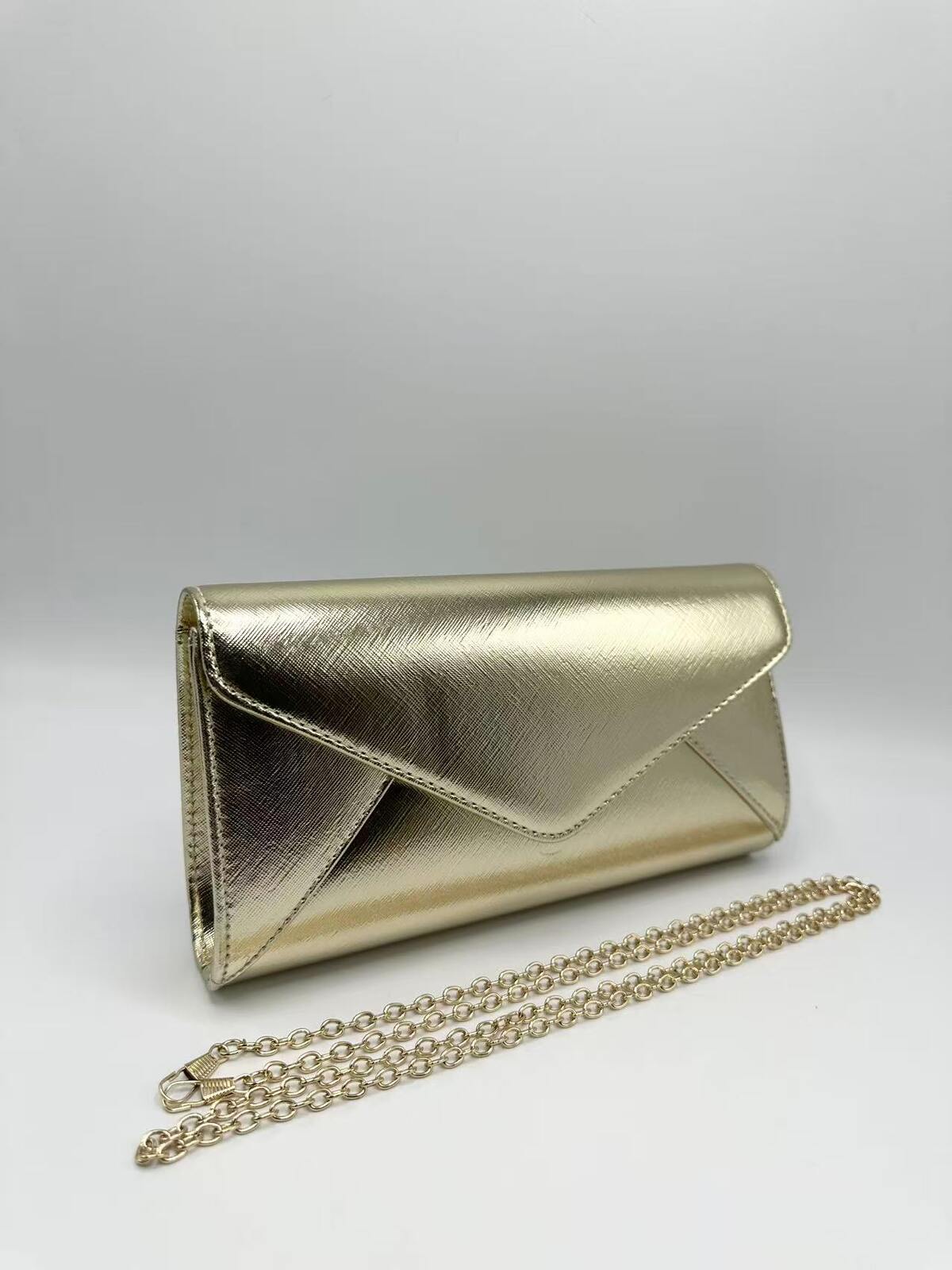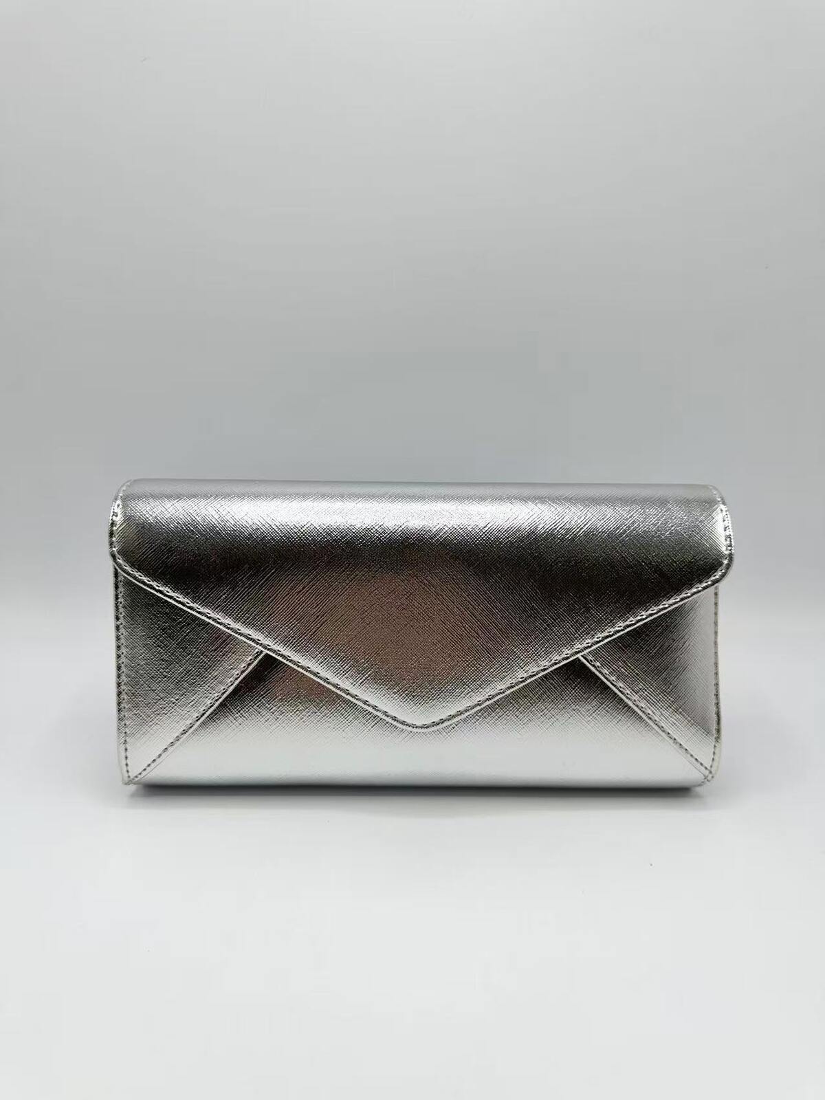 Deze elegante envelop clutch heeft een tijdloos en stijlvol ontwerp met een verfijnde metallic afwerking. De strakke lijnen en de klassieke envelopsluiting zorgen voor een chique uitstraling die perfect past bij zowel feestelijke als formele gelegenheden.