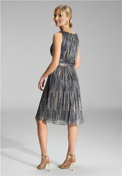 De jurk is uitgevoerd in een luxe geplisseerde stof met een subtiele glans, waardoor het geheel een chique en feestelijke uitstraling krijgt zonder overdadig te zijn. De soepelvallende rok beweegt licht en elegant mee bij iedere stap, wat zorgt voor een sierlijk en flatterend silhouet.