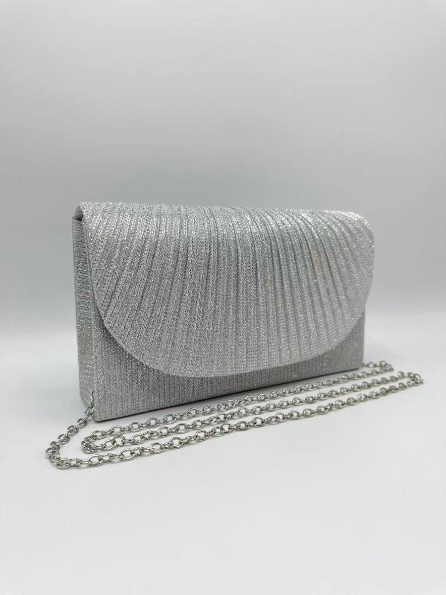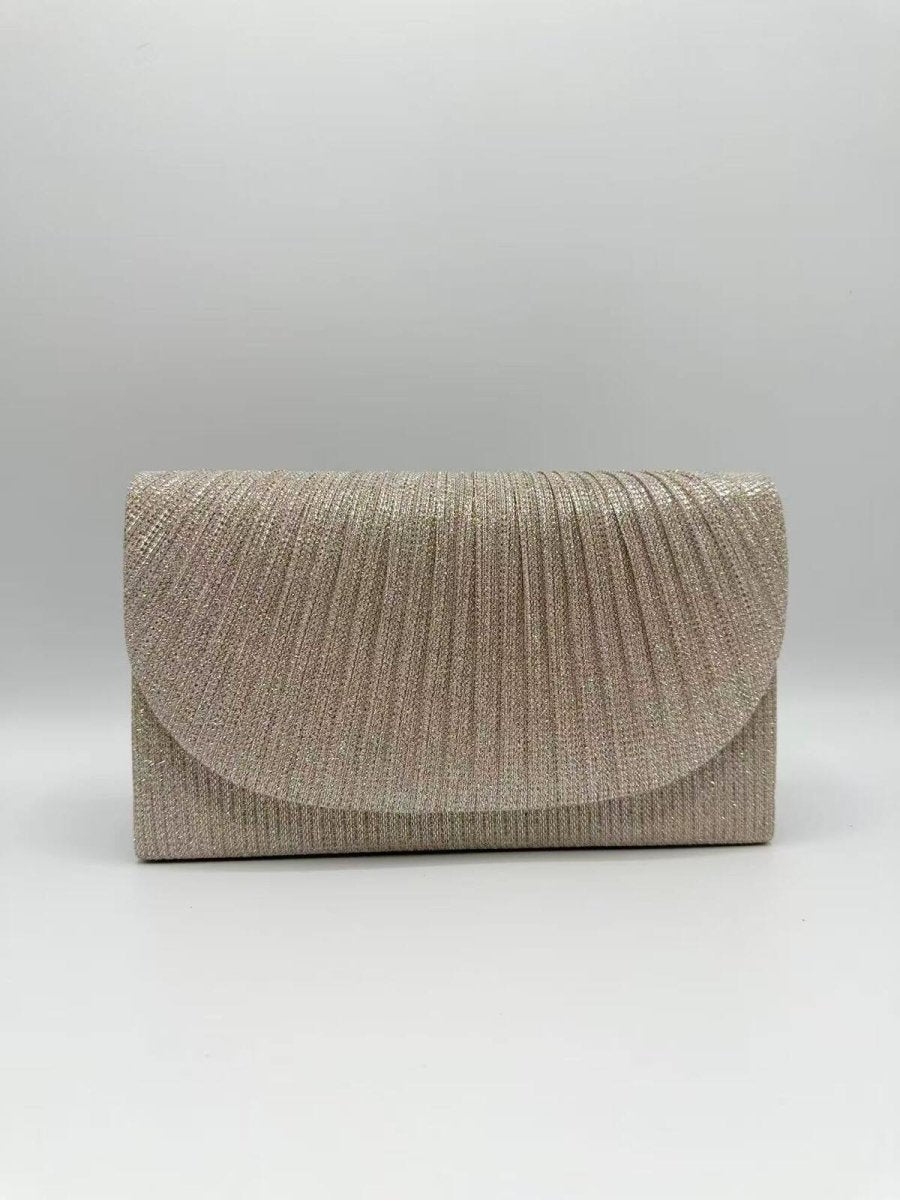 Deze luxe geplooide glitterclutch is een elegante eyecatcher voor iedere feestelijke gelegenheid. Het verfijnde design met verticale plooien en een afgeronde envelopklep geeft de tas een chique en stijlvolle uitstraling. De subtiele glitterafwerking zorgt voor een prachtige schittering die het licht op elegante wijze vangt.